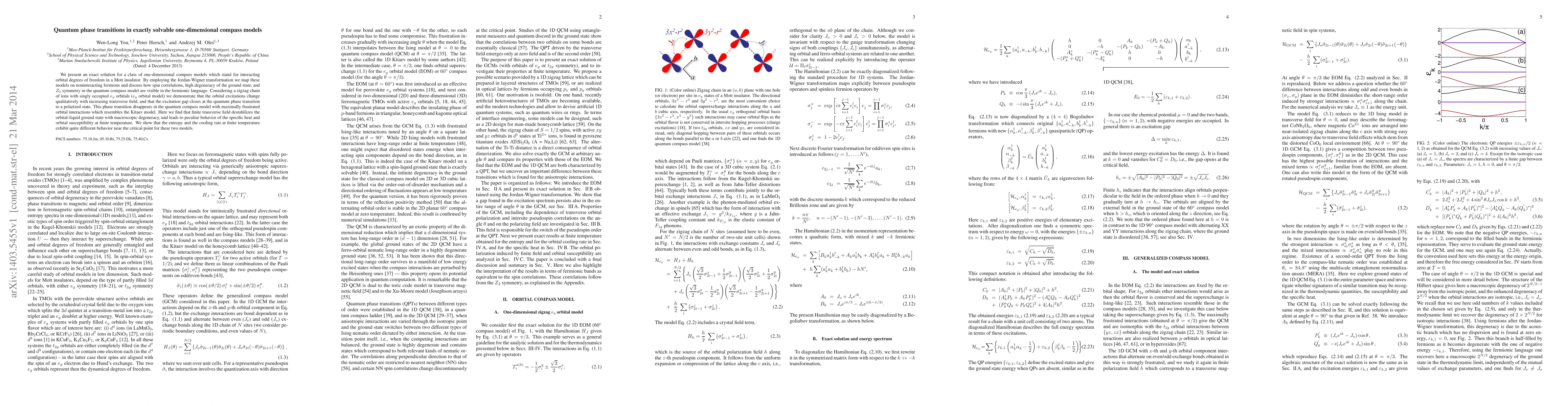 We present an exact solution for a class of one-dimensional compass models which stand for interacting orbital degrees of freedom in a Mott insulator. By employing the Jordan-Wigner transformation we map these models on noninteracting fermions and discuss how spin correlations, high degeneracy of the ground state, and $Z_2$ symmetry in the quantum compass model are visible in the fermionic language. Considering a zigzag chain of ions with singly occupied $e_g$ orbitals ($e_g$ orbital model) we demonstrate that the orbital excitations change qualitatively with increasing transverse field, and that the excitation gap closes at the quantum phase transition to a polarized state. This phase transition disappears in the quantum compass model with maximally frustrated orbital interactions which resembles the Kitaev model. Here we find that finite transverse field destabilizes the orbital-liquid ground state with macroscopic degeneracy, and leads to peculiar behavior of the specific heat and orbital susceptibility at finite temperature. We show that the entropy and the cooling rate at finite temperature exhibit quite different behavior near the critical point for these two models.