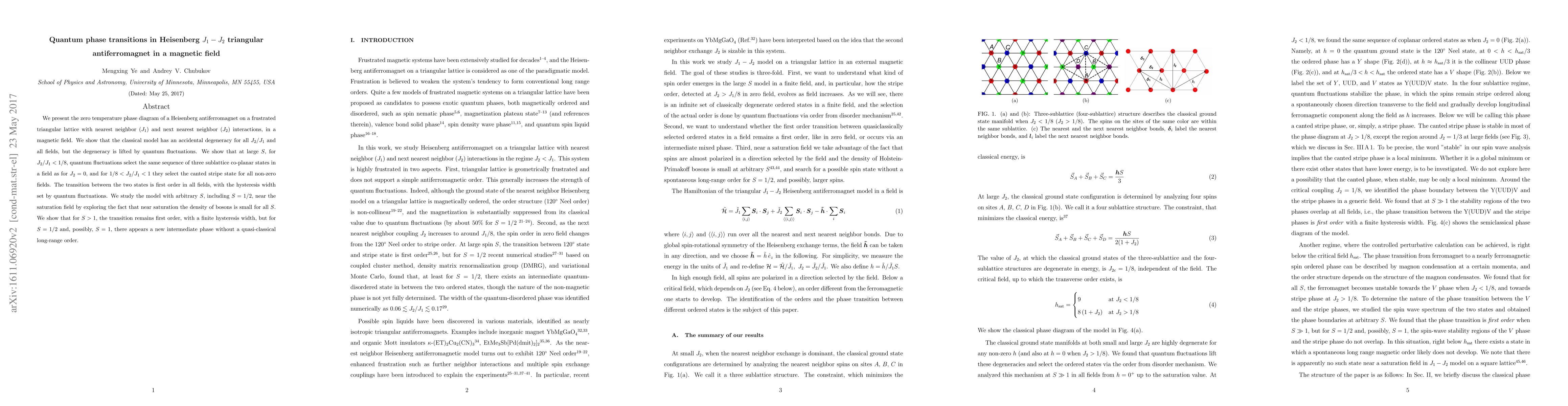 This paper investigates quantum phase transitions in a Heisenberg antiferromagnet with $J_1-J_2$ interactions on a triangular lattice under a magnetic field. It reveals that quantum fluctuations lift classical degeneracies, leading to distinct sublattice states and a first-order transition, with a new intermediate phase possibly emerging for half-integer spin values.
