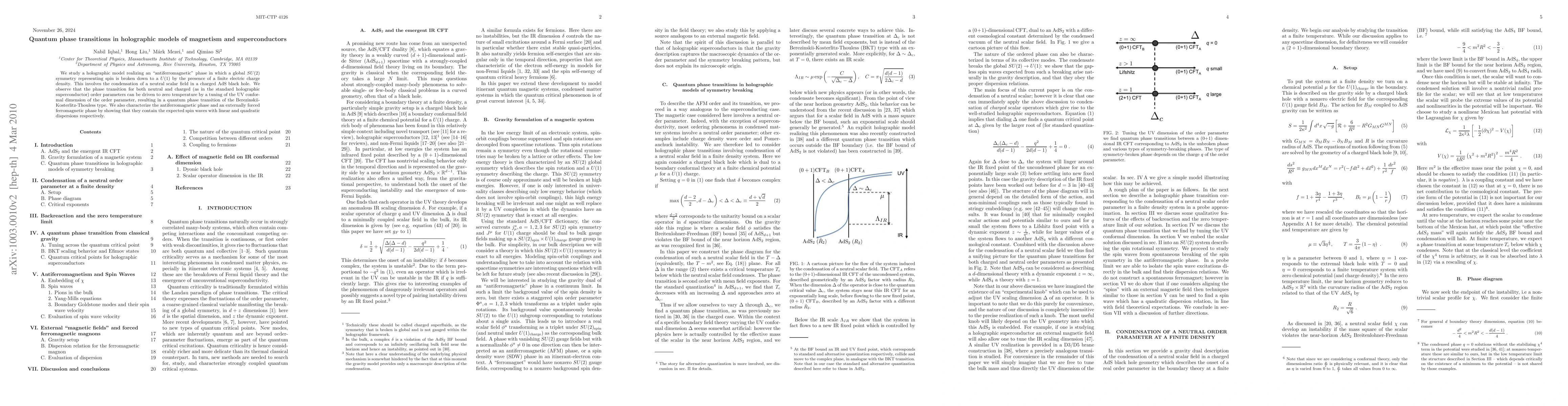 We study a holographic model realizing an "antiferromagnetic" phase in which a global SU(2) symmetry representing spin is broken down to a U(1) by the presence of a finite electric charge density. This involves the condensation of a neutral scalar field in a charged AdS black hole. We observe that the phase transition for both neutral and charged (as in the standard holographic superconductor) order parameters can be driven to zero temperature by a tuning of the UV conformal dimension of the order parameter, resulting in a quantum phase transition of the Berezinskii-Kosterlitz-Thouless type. We also characterize the antiferromagnetic phase and an externally forced ferromagnetic phase by showing that they contain the expected spin waves with linear and quadratic dispersions respectively.