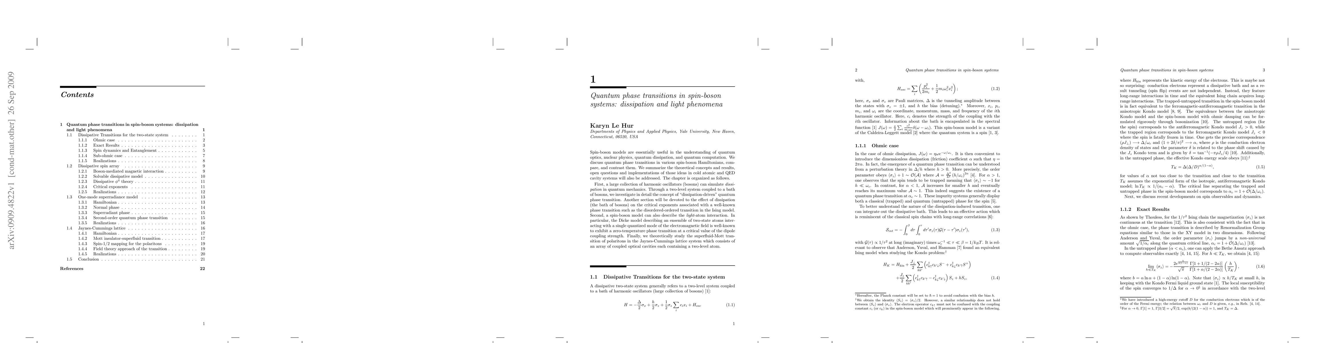 This paper explores quantum phase transitions in spin-boson systems, emphasizing the role of dissipation and light phenomena. It compares various spin-boson Hamiltonians, discusses theoretical concepts, and addresses open questions and practical implementations in cold atomic and QED cavity systems.