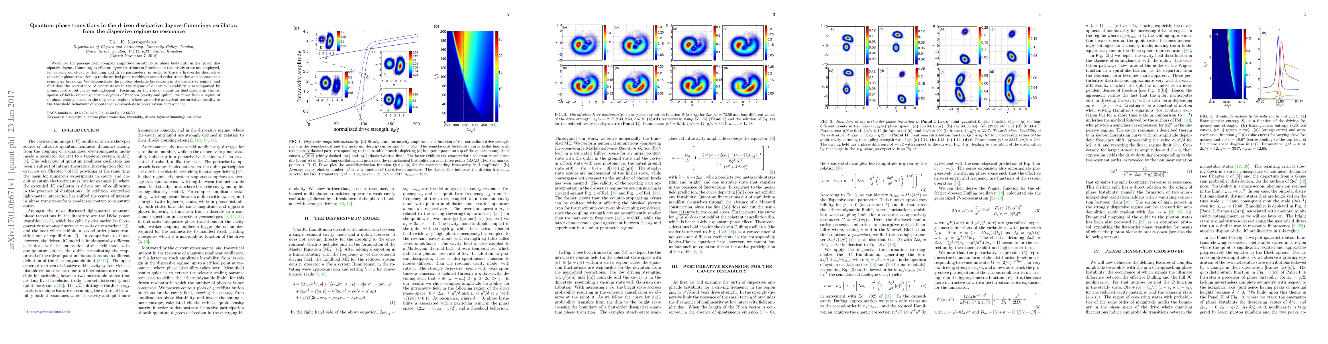 This paper investigates quantum phase transitions in a driven dissipative Jaynes-Cummings oscillator, tracking the transition from amplitude to phase bistability and identifying a first-order phase transition culminating in a second-order transition with spontaneous symmetry breaking. It highlights the breakdown of the photon blockade and significant qubit-cavity entanglement in the quantum bistability regime.