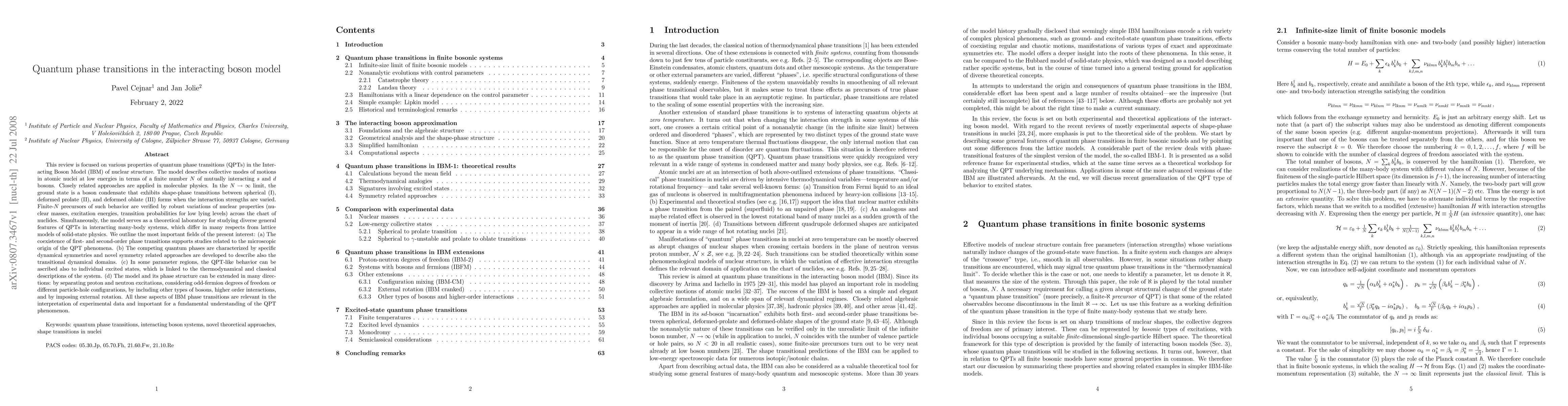 This paper reviews quantum phase transitions (QPTs) in the Interacting Boson Model (IBM) of nuclear structure, highlighting shape-phase transitions and their finite-size precursors. It discusses the coexistence of first- and second-order phase transitions, competing quantum phases, and the model's extension to various configurations, emphasizing its relevance for interpreting experimental data and understanding QPT phenomena.