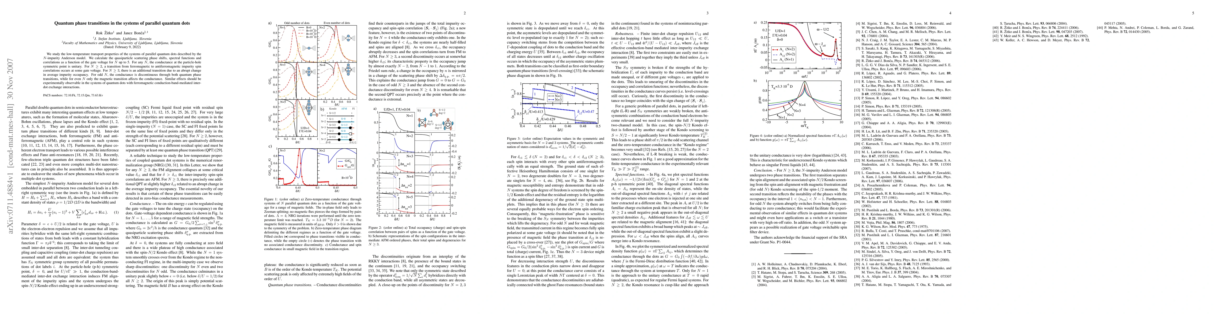 We study the low-temperature transport properties of the systems of parallel quantum dots described by the N-impurity Anderson model. We calculate the quasiparticle scattering phase shifts, spectral functions and correlations as a function of the gate voltage for N up to 5. For any N, the conductance at the particle-hole symmetric point is unitary. For N >= 2, a transition from ferromagnetic to antiferromagnetic impurity spin correlations occurs at some gate voltage. For N >= 3, there is an additional transition due to an abrupt change in average impurity occupancy. For odd N, the conductance is discontinuous through both quantum phase transitions, while for even N only the magnetic transition affects the conductance. Similar effects should be experimentally observable in the systems of quantum dots with ferromagnetic conduction-band-mediated inter-dot exchange interactions.