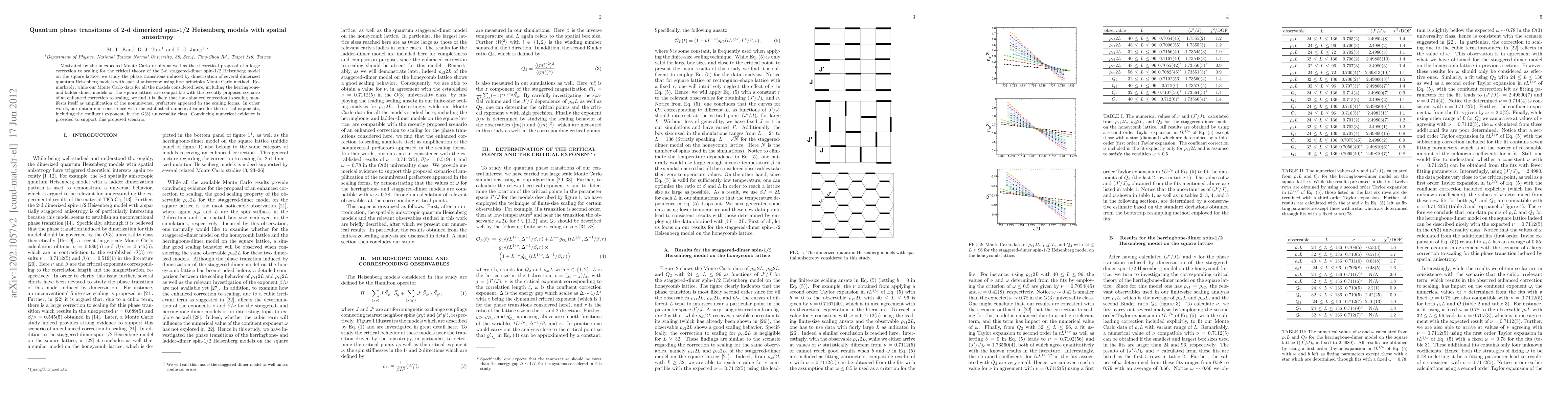 Motivated by the unexpected Monte Carlo results as well as the theoretical proposal of a large correction to scaling for the critical theory of the 2-d staggered-dimer spin-1/2 Heisenberg model on the square lattice, we study the phase transitions induced by dimerization of several dimerized quantum Heisenberg models with spatial anisotropy using first principles Monte Carlo method. Remarkably, while our Monte Carlo data for all the models considered here, including the herringbone- and ladder-dimer models on the square lattice, are compatible with the recently proposed scenario of an enhanced correction to scaling, we find it is likely that the enhanced correction to scaling manifests itself as amplification of the nonuniversal prefactors appeared in the scaling forms. In other words, our data are in consistence with the established numerical values for the critical exponents, including the confluent exponent, in the O(3) universality class. Convincing numerical evidence is provided to support this proposed scenario.