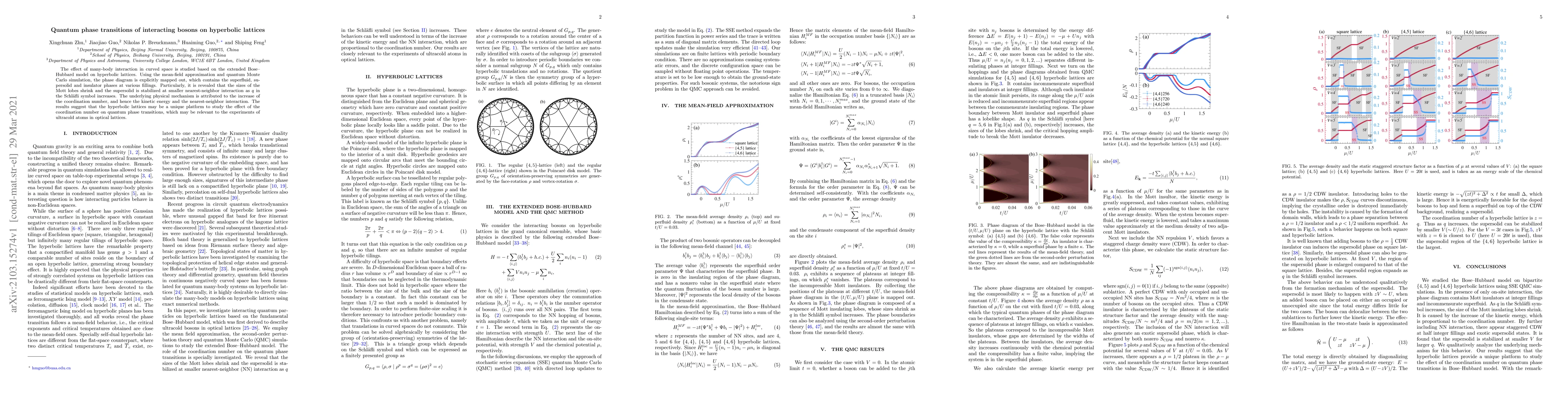This paper explores quantum phase transitions in interacting bosons on hyperbolic lattices using the extended Bose-Hubbard model, revealing a phase diagram with superfluid, supersolid, and insulator phases. The study finds that increasing the coordination number shrinks Mott lobes and stabilizes the supersolid phase, suggesting hyperbolic lattices as a unique platform for studying coordination number effects on quantum phase transitions.