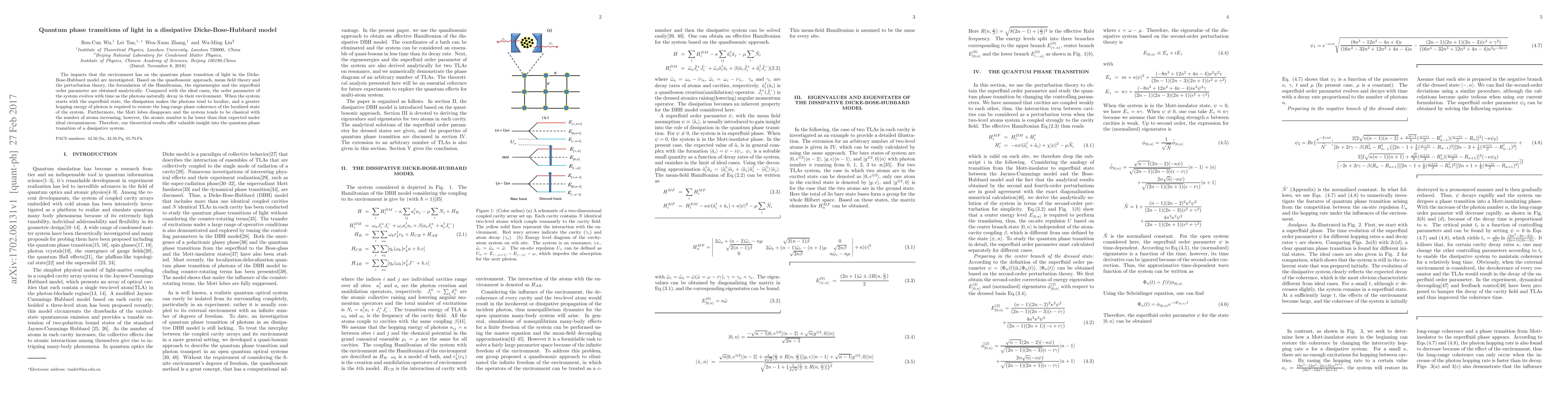 The impacts that the environment has on the quantum phase transition of light in the DickeBose-Hubbard model are investigated. Based on the quasibosonic approach, mean field theory and the perturbation theory, the formulation of the Hamiltonian, the eigenenergies and the superfluid order parameter are obtained analytically. Compared with the ideal cases, the order parameter of the system evolves with time as the photons naturally decay in their environment. When the system starts with the superfluid state, the dissipation makes the photons tend to localize, and a greater hopping energy of photon is required to restore the long-range phase coherence of the localized state of the system. Furthermore, the Mott lobes disappears and the system tends to be classical with the number of atoms increasing; however, the atomic number is far lower than that expected under ideal circumstances. Therefore, our theoretical results offer valuable insight into the quantum phase transition of a dissipative system.