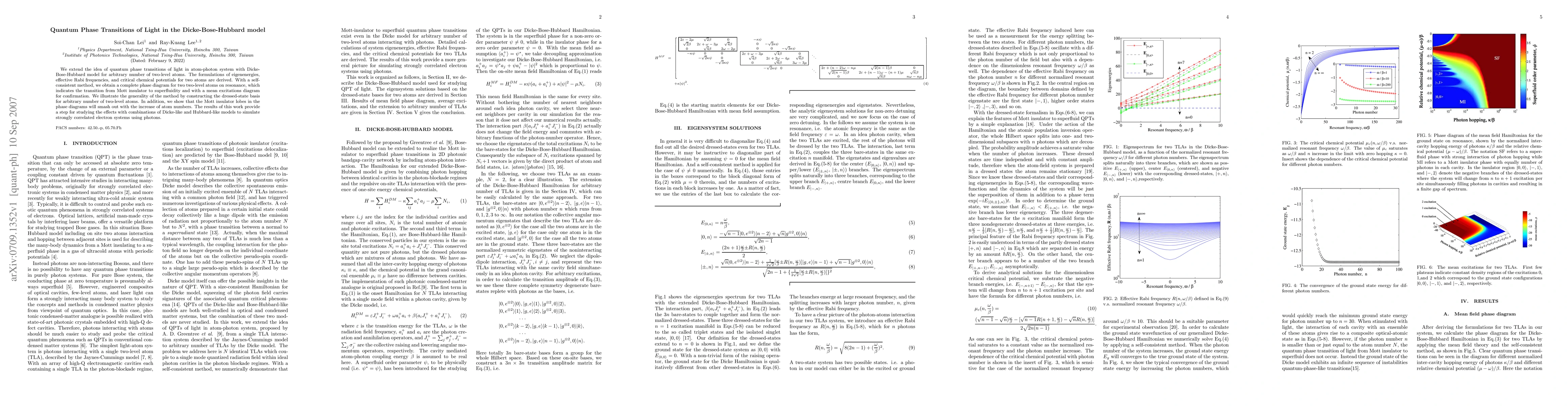 We extend the idea of quantum phase transitions of light in atom-photon system with Dicke-Bose-Hubbard model for arbitrary number of two-level atoms. The formulations of eigenenergies, effective Rabi frequencies, and critical chemical potentials for two atoms are derived. With a self-consistent method, we obtain a complete phase diagram for two two-level atoms on resonance, which indicates the transition from Mott insulator to superfluidity and with a mean excitations diagram for confirmation. We illustrate the generality of the method by constructing the dressed-state basis for arbitrary number of two-level atoms. In addition, we show that the Mott insulator lobes in the phase diagrams will smash out with the increase of atom numbers. The results of this work provide a step for studying the effects with combinations of Dicke-like and Hubbard-like models to simulate strongly correlated electron systems using photons.