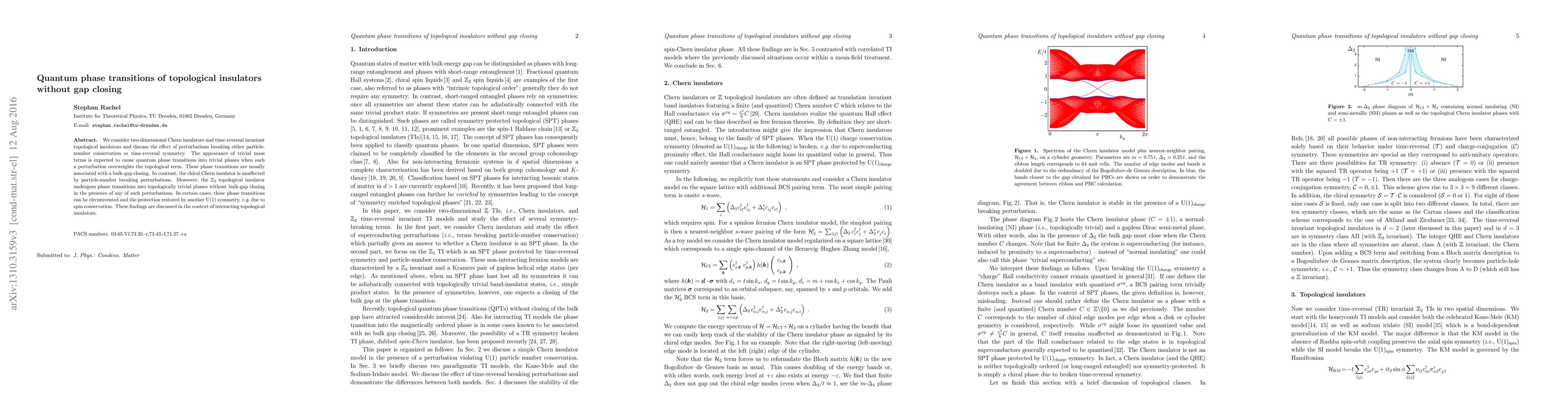 This paper explores quantum phase transitions in two-dimensional topological insulators, specifically Chern and $\mathbb{Z}_2$ insulators, under perturbations that break particle-number conservation or time-reversal symmetry. It reveals that while some transitions lead to gap closing, others, like those in $\mathbb{Z}_2$ insulators, can occur without gap closing, and can sometimes be restored by additional U(1) symmetries.