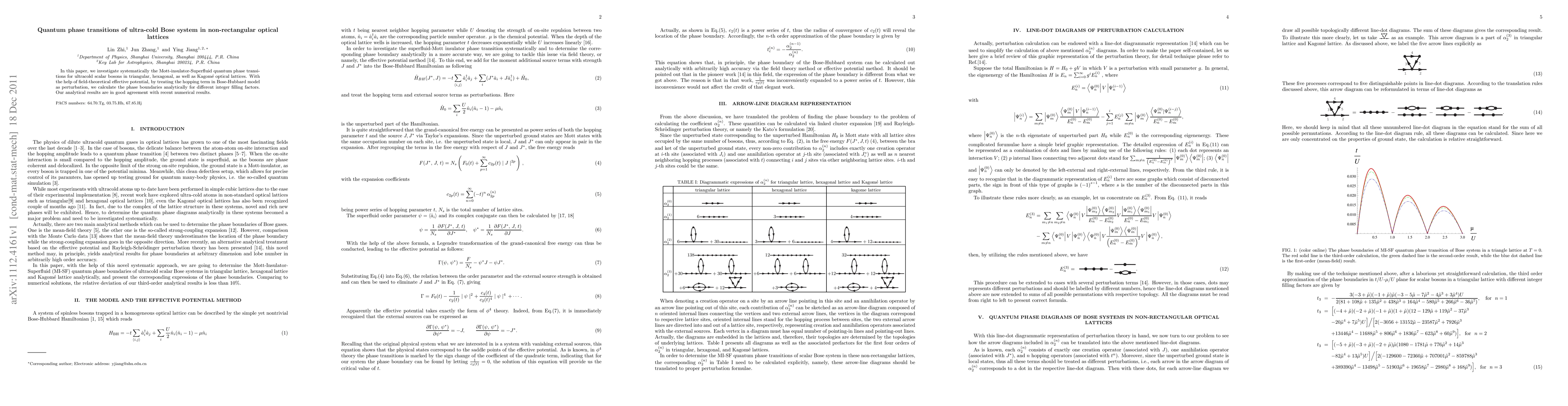 This paper systematically investigates quantum phase transitions in ultra-cold Bose systems within non-rectangular optical lattices, specifically triangular, hexagonal, and Kagom\'e configurations. Analytical calculations using field-theoretical effective potentials reveal the phase boundaries for various integer filling factors, corroborating recent numerical findings.