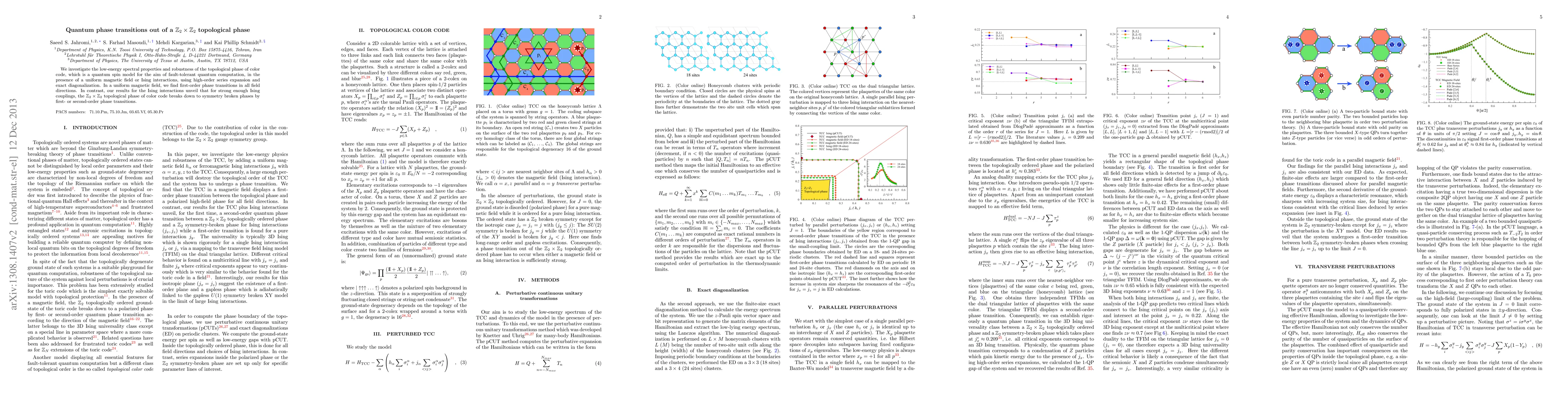 This paper examines the topological phase of a color code quantum spin model under uniform magnetic fields and Ising interactions, revealing first-order phase transitions in magnetic fields and both first- and second-order transitions under strong Ising couplings. The study uses high-order series expansion and exact diagonalization to explore these quantum phase transitions.