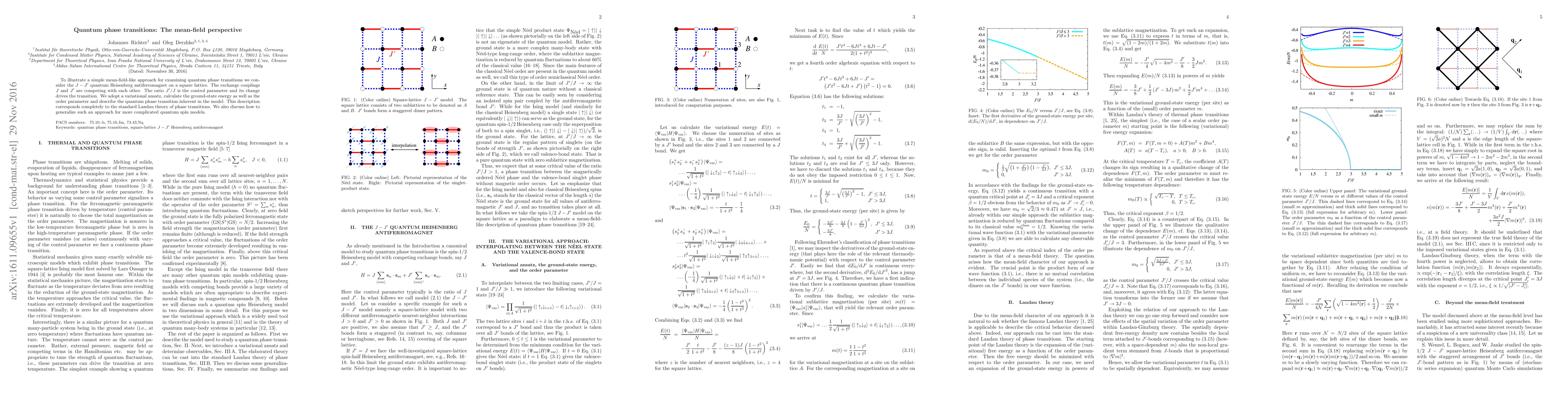 To illustrate a simple mean-field-like approach for examining quantum phase transitions we consider the $J-J^\prime$ quantum Heisenberg antiferromagnet on a square lattice. The exchange couplings $J$ and $J^\prime$ are competing with each other. The ratio $J^\prime/J$ is the control parameter and its change drives the transition. We adopt a variational ansatz, calculate the ground-state energy as well as the order parameter and describe the quantum phase transition inherent in the model. This description corresponds completely to the standard Landau theory of phase transitions. We also discuss how to generalize such an approach for more complicated quantum spin models.