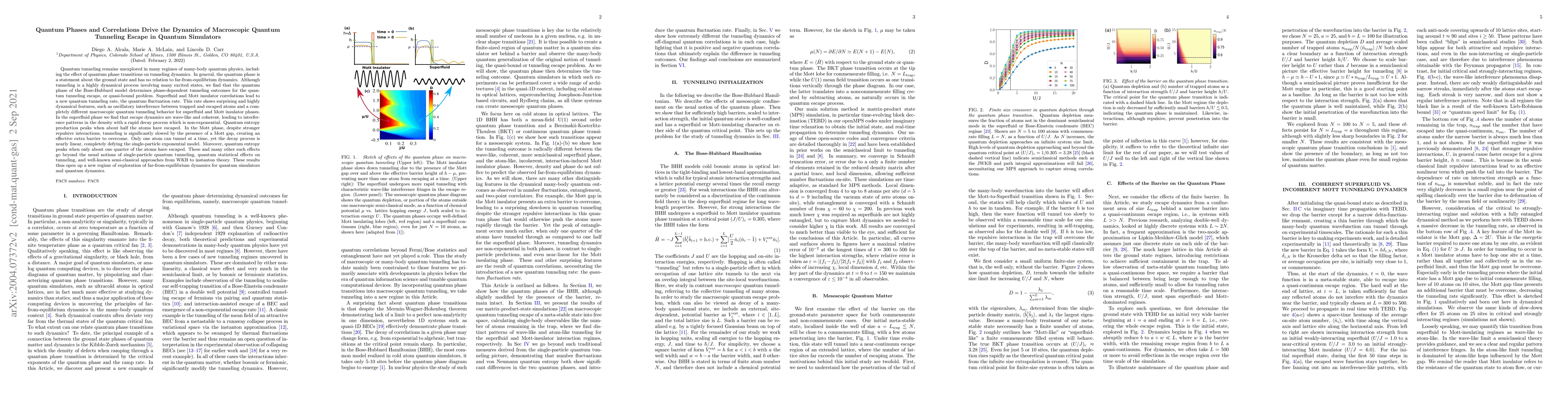 This paper explores how quantum phases and correlations in the Bose-Hubbard model influence macroscopic quantum tunneling escape dynamics in quantum simulators. It reveals that the quantum phase determines phase-dependent tunneling outcomes, leading to distinct tunneling rates and behaviors in superfluid and Mott insulator phases, with significant implications for far-from-equilibrium dynamics.