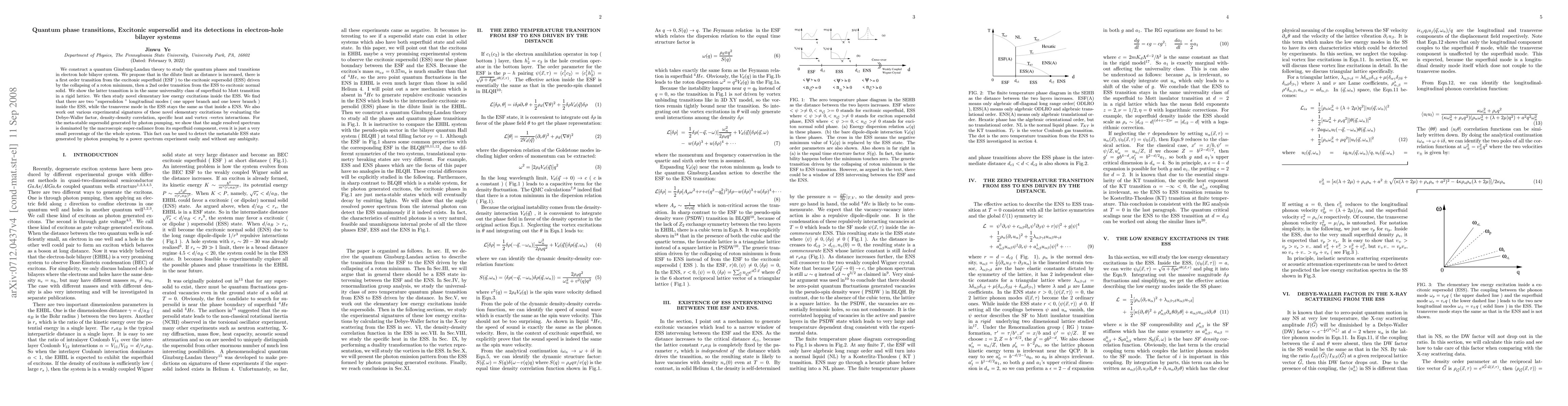 We construct a quantum Ginsburg-Landau theory to study the quantum phases and transitions in electron hole bilayer system. We propose that in the dilute limit as distance is increased, there is a first order transition from the excitonic superfluid (ESF) to the excitonic supersolid (ESS) driven by the collapsing of a roton minimum, then a 2nd order transition from the ESS to excitonic normal solid. We show the latter transition is in the same universality class of superfluid to Mott transition in a rigid lattice. We then study novel elementary low energy excitations inside the ESS. We find that there are two "supersolidon" longitudinal modes (one upper branch and one lower branch) inside the ESS, while the transverse mode in the ESS stays the same as that inside a ENS. We also work out various experimental signatures of these novel elementary excitations by evaluating the Debye-Waller factor, density-density correlation, specific heat and vortex -vertex interactions. For the meta-stable supersolid generated by photon pumping, we show that the angle resolved spectrum is dominated by the macroscopic super-radiance from its superfluid component, even it is just a very small percentage of the the whole system. This fact can be used to detect the metastable ESS state generated by photon pumping by a power spectrum experiment easily and without any ambiguity.