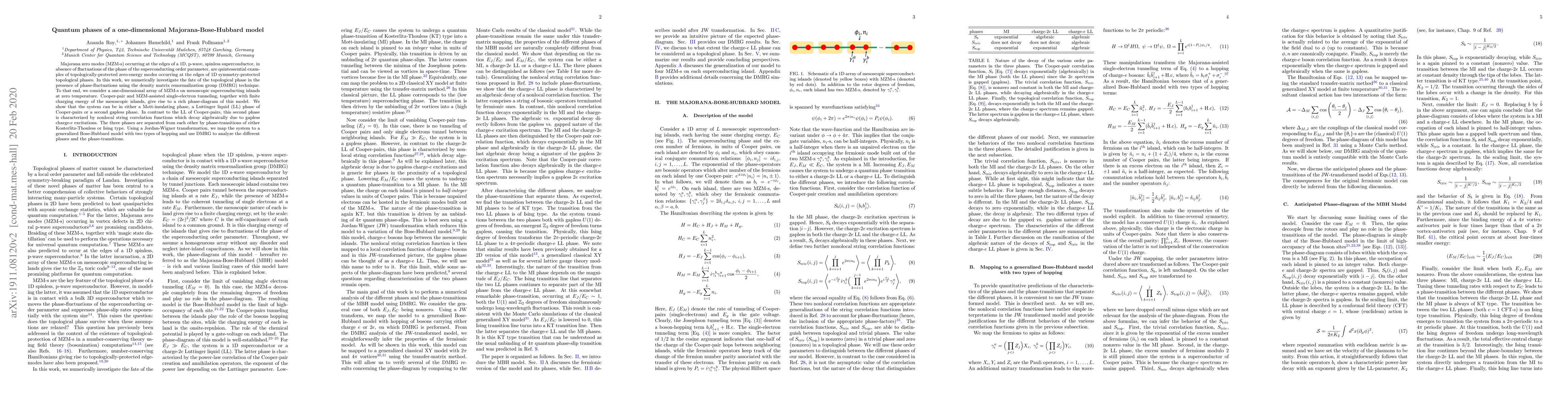 Majorana zero modes (MZM-s) occurring at the edges of a 1D, p-wave, spinless superconductor, in absence of fluctuations of the phase of the superconducting order parameter, are quintessential examples of topologically-protected zero-energy modes occurring at the edges of 1D symmetry-protected topological phases. In this work, we numerically investigate the fate of the topological phase in the presence of phase-fluctuations using the density matrix renormalization group (DMRG) technique. To that end, we consider a one-dimensional array of MZM-s on mesoscopic superconducting islands at zero temperature. Cooper-pair and MZM-assisted single-electron tunneling, together with finite charging energy of the mesoscopic islands, give rise to a rich phase-diagram of this model. We show that the system can be in either a Mott-insulating phase, a Luttinger liquid (LL) phase of Cooper-pairs or a second gapless phase. In contrast to the LL of Cooper-pairs, this second phase is characterized by nonlocal string correlation functions which decay algebraically due to gapless charge-$e$ excitations. The three phases are separated from each other by phase-transitions of either Kosterlitz-Thouless or Ising type. Using a Jordan-Wigner transformation, we map the system to a generalized Bose-Hubbard model with two types of hopping and use DMRG to analyze the different phases and the phase-transitions.
