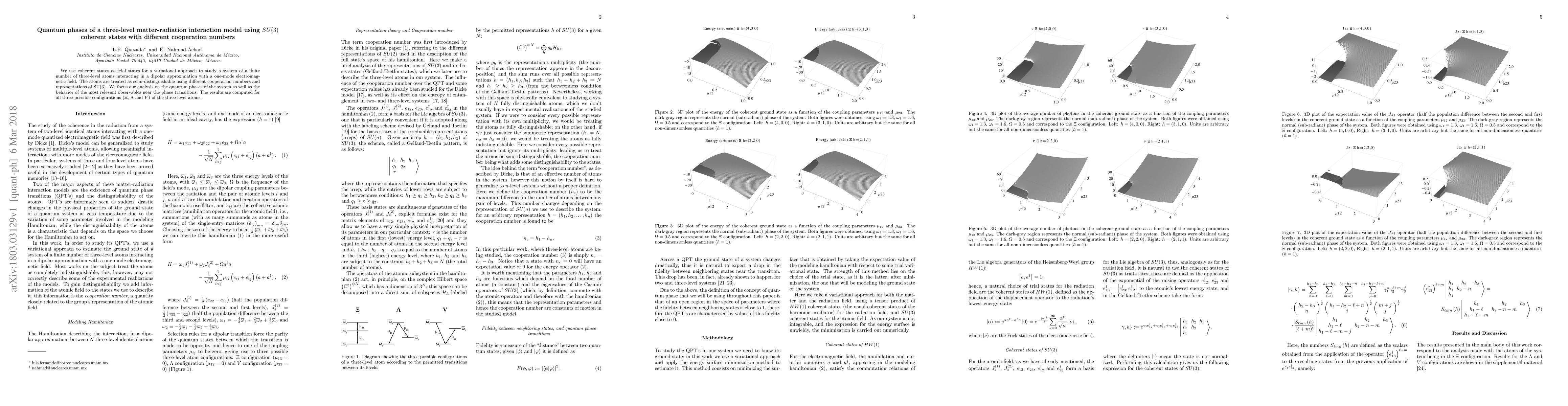 This paper investigates quantum phases in a three-level matter-radiation interaction model using $SU(3)$ coherent states, treating atoms as semi-distinguishable with different cooperation numbers. The study focuses on phase transitions and relevant observables in three atomic configurations ($\Xi$, $\Lambda$, and $V$).
