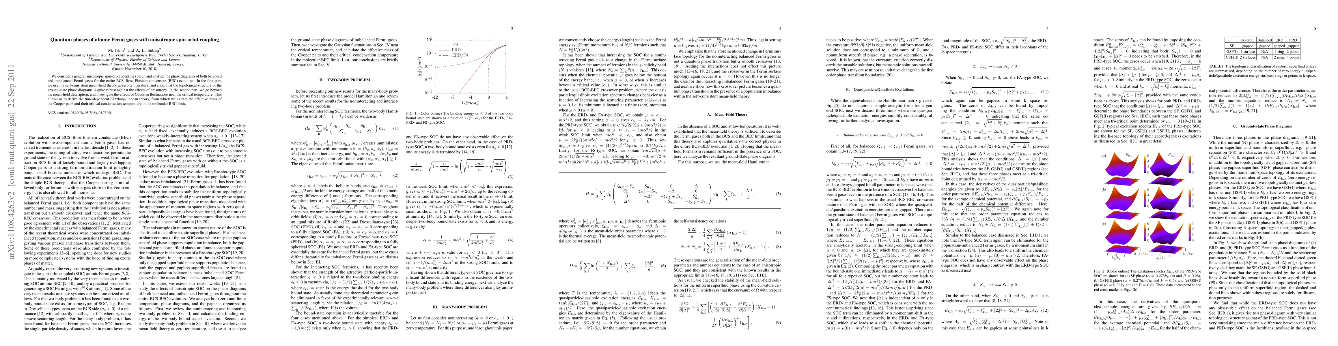 This paper examines the quantum phases of atomic Fermi gases with anisotropic spin-orbit coupling, detailing phase diagrams for balanced and imbalanced states across BCS to BEC evolution. It uses self-consistent mean-field theory to show robust topological structures and extends analysis to Gaussian fluctuations to derive the time-dependent Ginzburg-Landau theory, determining Cooper pair mass and critical condensation temperature.