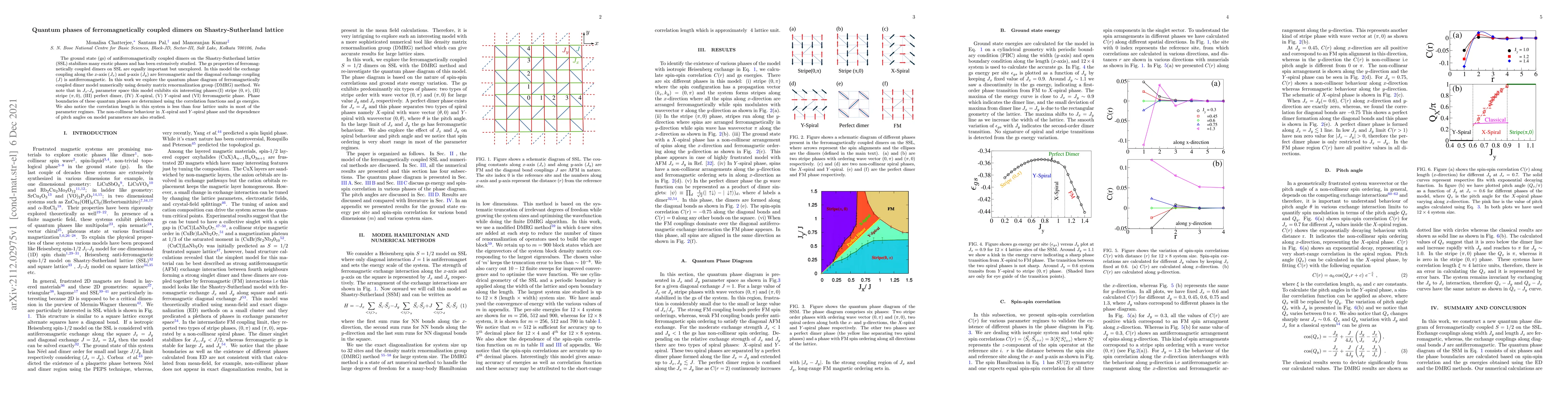 This study numerically investigates the quantum phase diagram of ferromagnetically coupled dimers on the Shastry-Sutherland lattice using the DMRG method, identifying six distinct phases: stripe, perfect dimer, X-spiral, Y-spiral, and ferromagnetic, with phase boundaries determined by correlation functions and ground state energies.