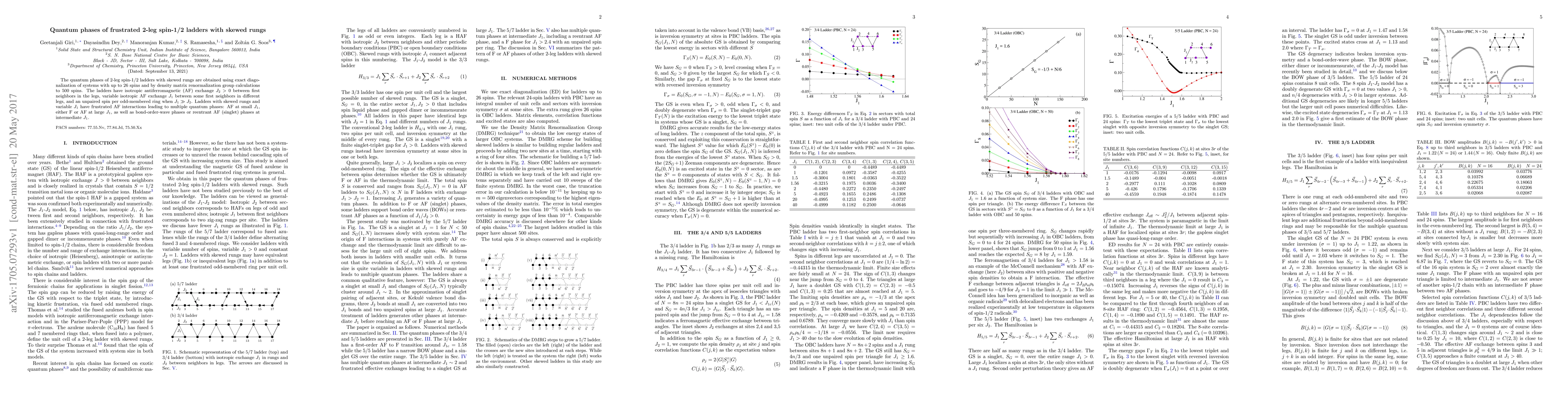 The quantum phases of 2-leg spin-1/2 ladders with skewed rungs are obtained using exact diagonalization of systems with up to 26 spins and by density matrix renormalization group calculations to 500 spins. The ladders have isotropic antiferromagnetic (AF) exchange $J_2 > 0$ between first neighbors in the legs, variable isotropic AF exchange $J_1$ between some first neighbors in different legs, and an unpaired spin per odd-membered ring when $J_1 \gg J_2$. Ladders with skewed rungs and variable $J_1$ have frustrated AF interactions leading to multiple quantum phases: AF at small $J_1$, either F or AF at large $J_1$, as well as bond-order-wave phases or reentrant AF (singlet) phases at intermediate $J_1$.