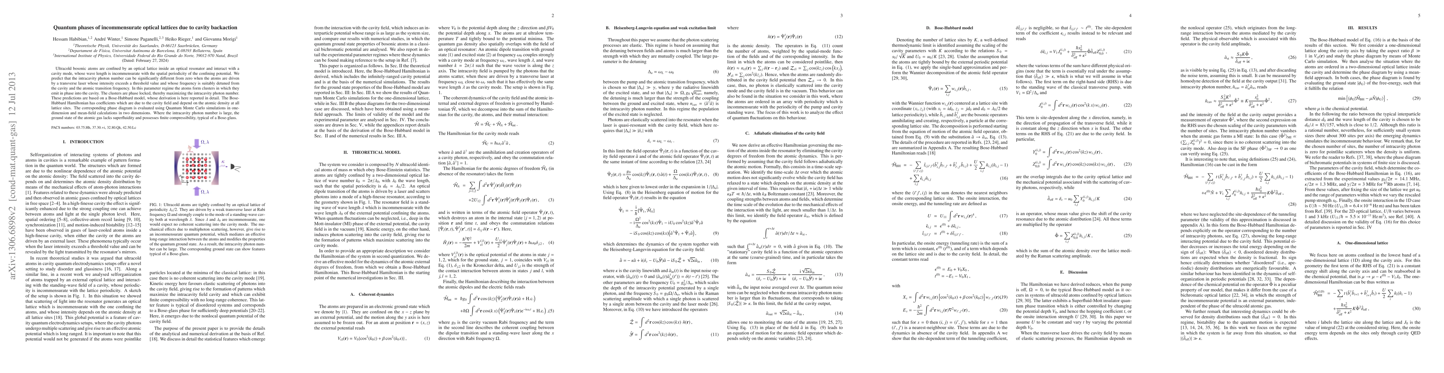 Ultracold bosonic atoms are confined by an optical lattice inside an optical resonator and interact with a cavity mode, whose wave length is incommensurate with the spatial periodicity of the confining potential. We predict that the intracavity photon number can be significantly different from zero when the atoms are driven by a transverse laser whose intensity exceeds a threshold value and whose frequency is suitably detuned from the cavity and the atomic transition frequency. In this parameter regime the atoms form clusters in which they emit in phase into the cavity. The clusters are phase locked, thereby maximizing the intracavity photon number. These predictions are based on a Bose-Hubbard model, whose derivation is here reported in detail. The Bose-Hubbard Hamiltonian has coefficients which are due to the cavity field and depend on the atomic density at all lattice sites. The corresponding phase diagram is evaluated using Quantum Monte Carlo simulations in one-dimension and mean-field calculations in two dimensions. Where the intracavity photon number is large, the ground state of the atomic gas lacks superfluidity and possesses finite compressibility, typical of a Bose-glass.