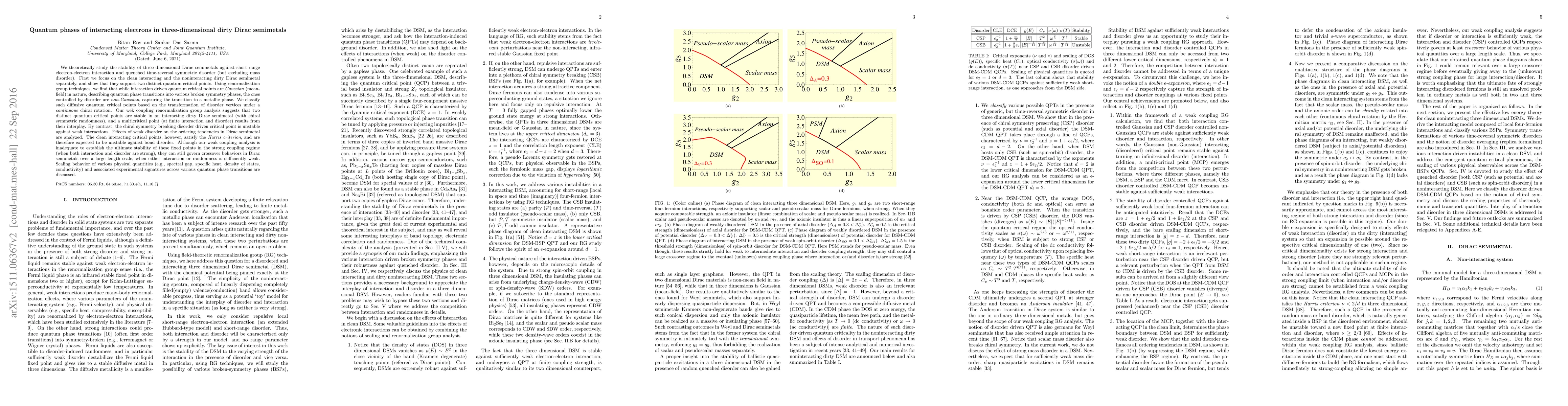 This paper investigates the quantum phases and critical points in three-dimensional dirty Dirac semimetals under electron-electron interactions and disorder. It finds distinct Gaussian and non-Gaussian critical points, with the latter leading to metallic phases, and classifies these based on chiral rotations. The study concludes that two stable quantum critical points exist in interacting dirty Dirac semimetals, while chiral symmetry breaking disorder-driven critical points are unstable against weak interactions.