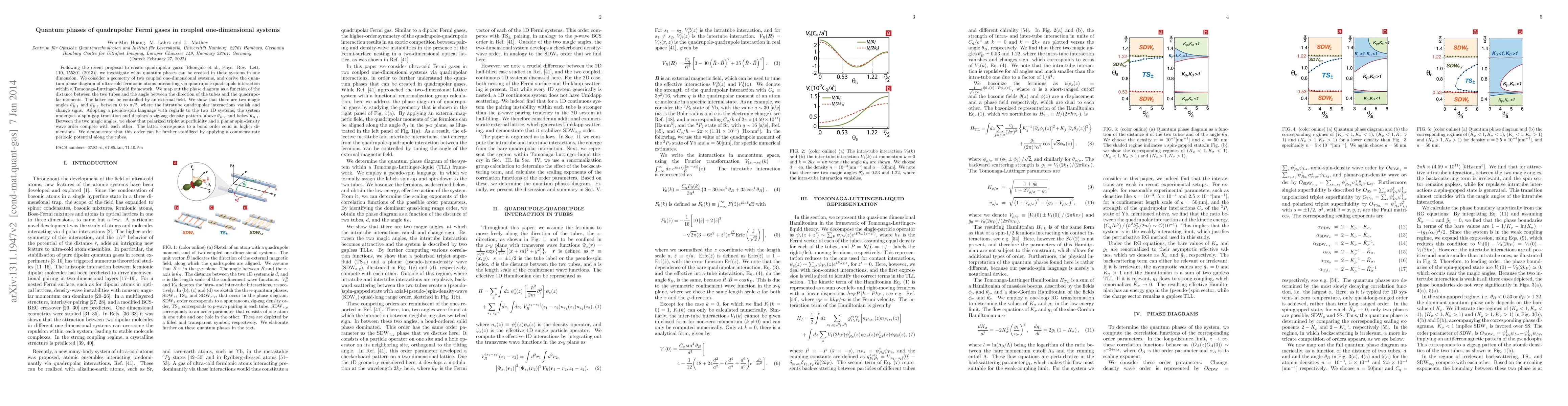 Following the recent proposal to create quadrupolar gases [S.G. Bhongale et al., Phys. Rev. Lett. 110, 155301 (2013)], we investigate what quantum phases can be created in these systems in one dimension. We consider a geometry of two coupled one-dimensional systems, and derive the quantum phase diagram of ultra-cold fermionic atoms interacting via quadrupole-quadrupole interaction within a Tomonaga-Luttinger-liquid framework. We map out the phase diagram as a function of the distance between the two tubes and the angle between the direction of the tubes and the quadrupolar moments. The latter can be controlled by an external field. We show that there are two magic angles $\theta^{c}_{B,1}$ and $\theta^{c}_{B,2}$ between $0$ to $\pi/2$, where the intratube quadrupolar interactions vanish and change signs. Adopting a pseudo-spin language with regards to the two 1D systems, the system undergoes a spin-gap transition and displays a zig-zag density pattern, above $\theta^{c}_{B,2}$ and below $\theta^{c}_{B,1}$. Between the two magic angles, we show that polarized triplet superfluidity and a planar spin-density wave order compete with each other. The latter corresponds to a bond order solid in higher dimensions. We demonstrate that this order can be further stabilized by applying a commensurate periodic potential along the tubes.
