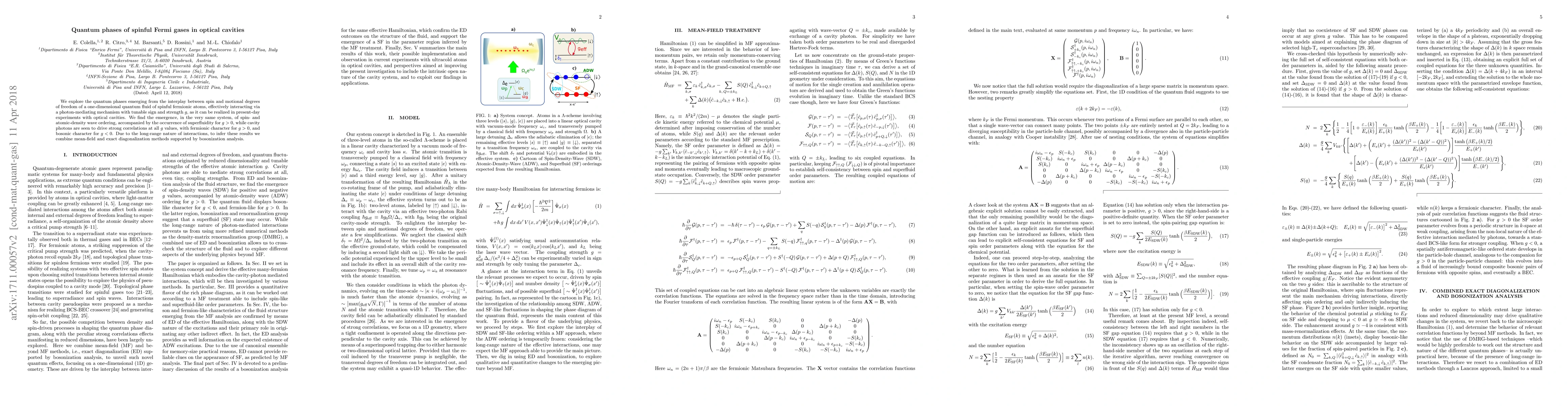 We explore the quantum phases emerging from the interplay between spin and motional degrees of freedom of a one-dimensional quantum fluid of spinful fermionic atoms, effectively interacting via a photon-mediating mechanism with tunable sign and strength g, as it can be realized in present-day experiments with optical cavities. We find the emergence, in the very same system, of spin- and atomic-density wave ordering, accompanied by the occurrence of superfluidity for g > 0, while cavity photons are seen to drive strong correlations at all g values, with fermionic character for g > 0, and bosonic character for g < 0. Due to the long-range nature of interactions, to infer these results we combine mean-field and exact diagonalization methods supported by bosonization analysis.