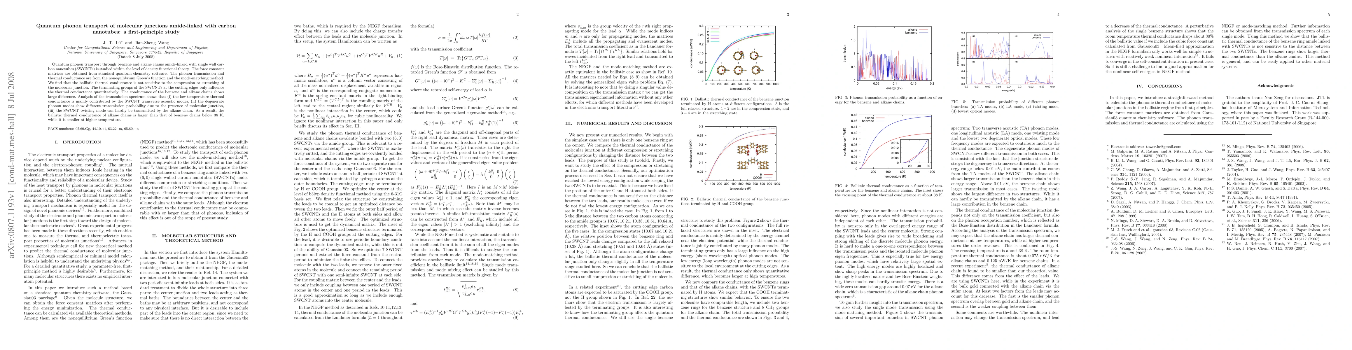 Quantum phonon transport through benzene and alkane chains amide-linked with single wall carbon nanotubes (SWCNTs) is studied within the level of density functional theory. The force constant matrices are obtained from standard quantum chemistry software. The phonon transmission and thermal conductance are from the nonequilibrium Green's function and the mode-matching method. We find that the ballistic thermal conductance is not sensitive to the compression or stretching of the molecular junction. The terminating groups of the SWCNTs at the cutting edges only influence the thermal conductance quantitatively. The conductance of the benzene and alkane chains shows large difference. Analysis of the transmission spectrum shows that (i) the low temperature thermal conductance is mainly contributed by the SWCNT transverse acoustic modes, (ii) the degenerate phonon modes show different transmission probability due to the presence of molecular junction, (iii) the SWCNT twisting mode can hardly be transmitted by the alkane chain. As a result, the ballistic thermal conductance of alkane chains is larger than that of benzene chains below 38 K, while it is smaller at higher temperature.