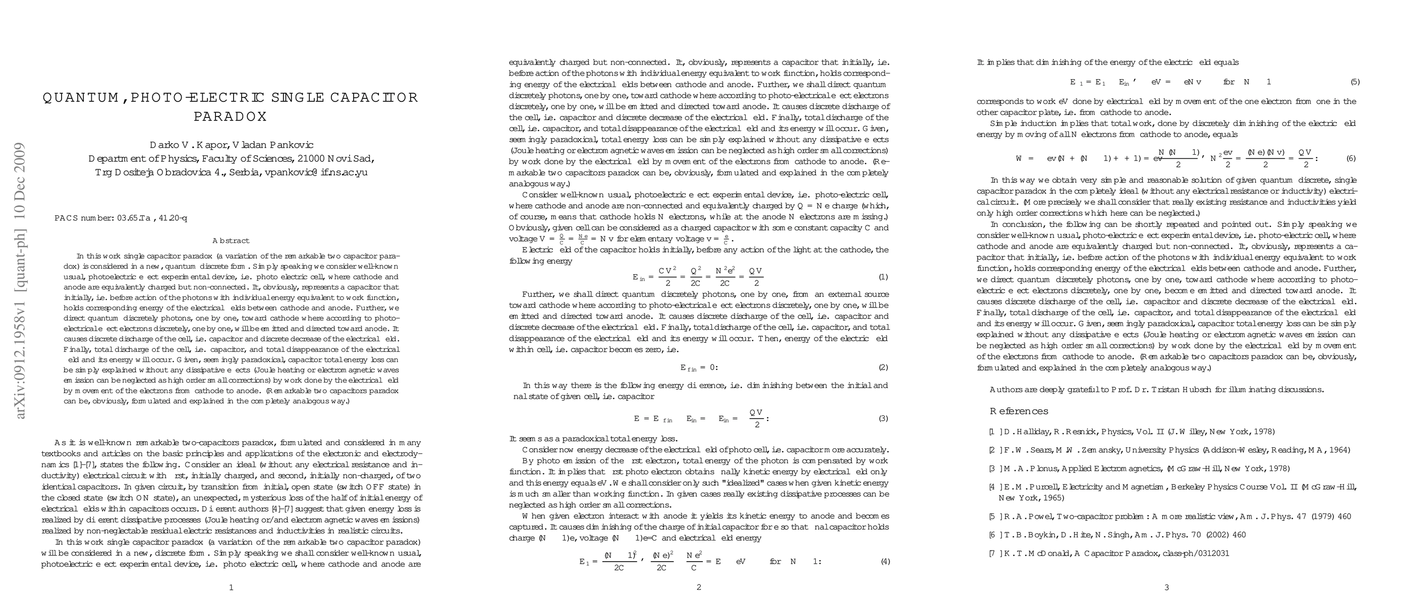 In this work single capacitor paradox (a variation of the remarkable two capacitor paradox) is considered in a new, quantum discrete form. Simply speaking we consider well-known usual, photoelectric effect experimental device, i.e. photo electric cell, where cathode and anode are equivalently charged but non-connected. It, obviously, represents a capacitor that initially, i.e. before action of the photons with individual energy equivalent to work function, holds corresponding energy of the electrical fields between cathode and anode. Further, we direct quantum discretely photons, one by one, toward cathode where according to photo-electrical effect electrons discretely, one by one, will be emitted and directed toward anode. It causes discrete discharge of the cell, i.e. capacitor and discrete decrease of the electrical field. Finally, total discharge of the cell, i.e. capacitor, and total disappearance of the electrical field and its energy will occur. Given, seemingly paradoxical, capacitor total energy loss can be simply explained without any dissipative effects (Joule heating or electromagnetic waves emission can be neglected as high order small corrections) by work done by the electrical field by movement of the electrons from cathode to anode. (Remarkable two capacitors paradox can be, obviously, formulated and explained in the completely analogous way.)