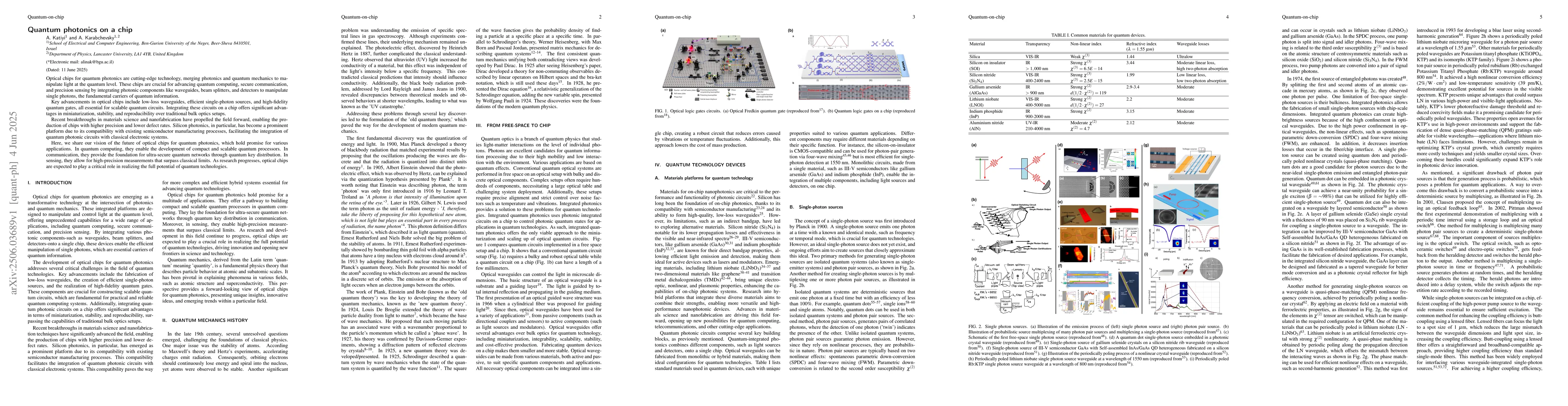 The paper presents a comprehensive review of materials, single-photon sources, detectors, and photon manipulation components for quantum photonics on optical chips, emphasizing recent advancements in materials science and nanofabrication.