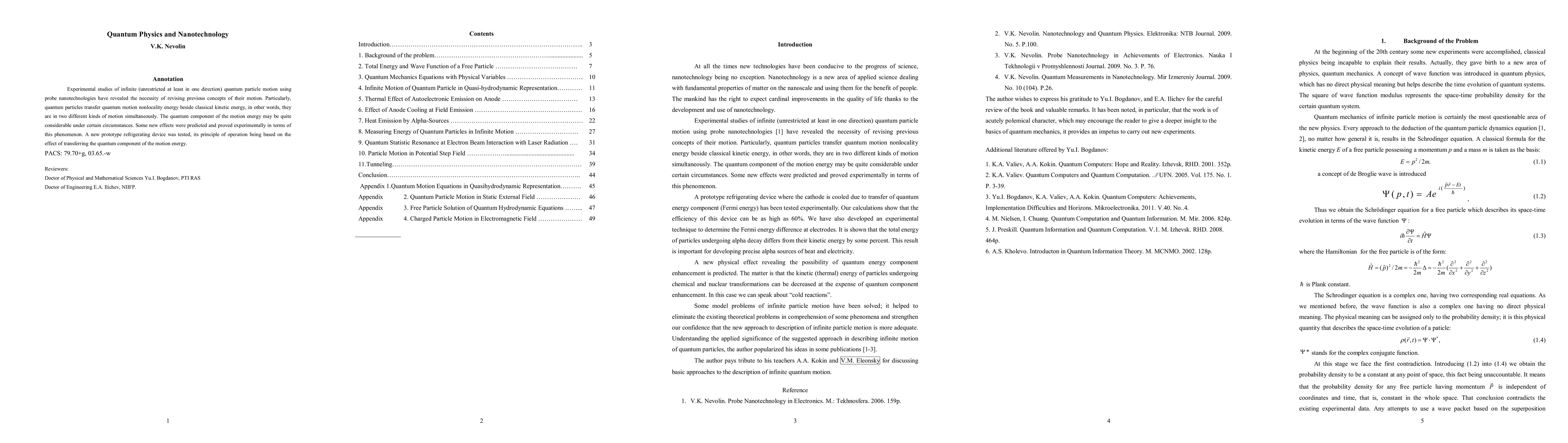 Experimental studies of infinite (unrestricted at least in one direction) quantum particle motion using probe nanotechnologies have revealed the necessity of revising previous concepts of their motion. Particularly, quantum particles transfer quantum motion nonlocality energy beside classical kinetic energy, in other words, they are in two different kinds of motion simultaneously. The quantum component of the motion energy may be quite considerable under certain circumstances. Some new effects were predicted and proved experimentally in terms of this phenomenon. A new prototype refrigerating device was tested, its principle of operation being based on the effect of transferring the quantum component of the motion energy.
