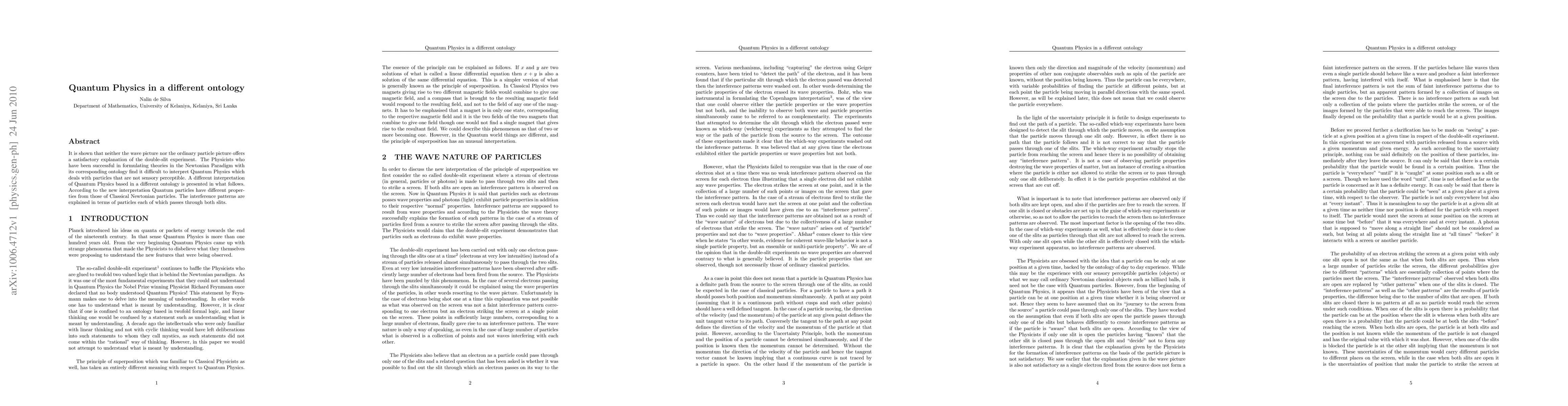 It is shown that neither the wave picture nor the ordinary particle picture offers a satisfactory explanation of the double-slit experiment. The Physicists who have been successful in formulating theories in the Newtonian Paradigm with its corresponding ontology find it difficult to interpret Quantum Physics which deals with particles that are not sensory perceptible. A different interpretation of Quantum Physics based in a different ontology is presented in what follows. According to the new interpretation Quantum particles have different properties from those of Classical Newtonian particles. The interference patterns are explained in terms of particles each of which passes through both slits.