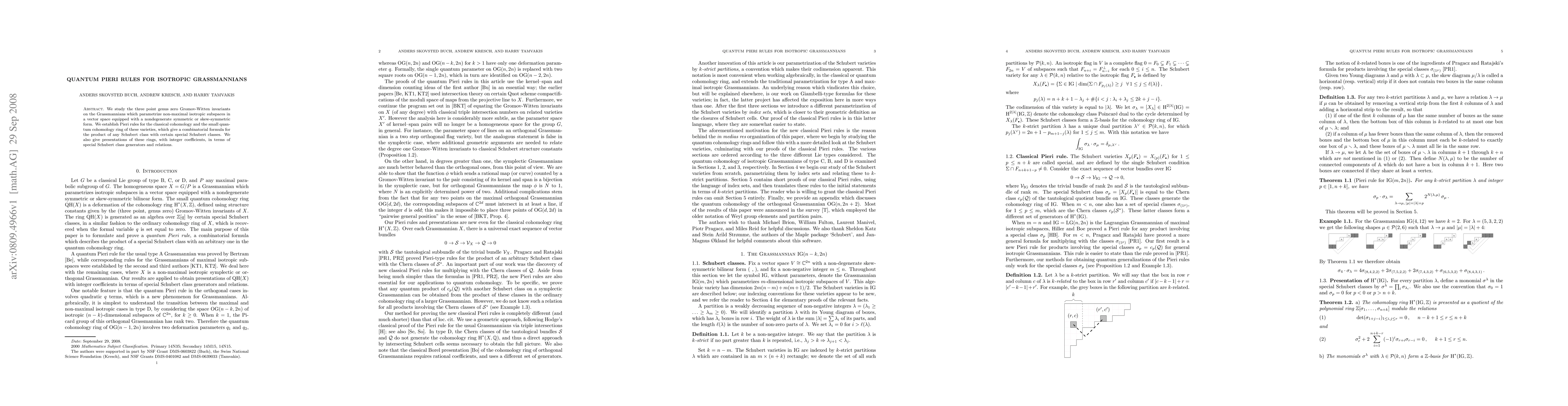 This paper establishes Pieri rules for the classical and quantum cohomology rings of isotropic Grassmannians, providing combinatorial formulas for the product of Schubert classes, and presents these rings with integer coefficients in terms of special Schubert classes and their relations.