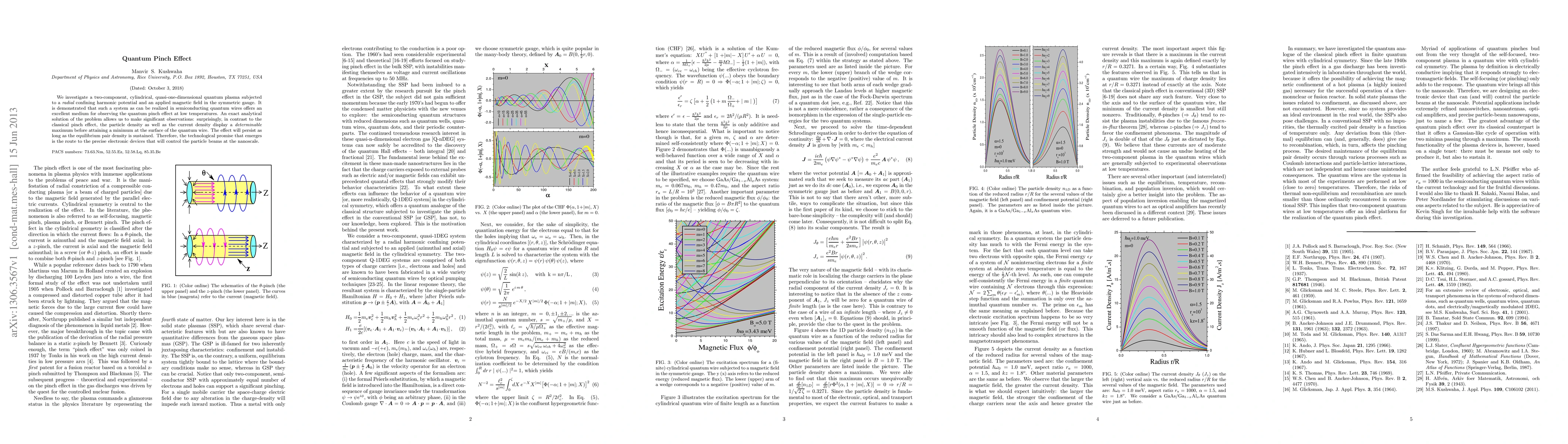 We investigate a two-component, cylindrical, quasi-one-dimensional quantum plasma subjected to a {\em radial} confining harmonic potential and an applied magnetic field in the symmetric gauge. It is demonstrated that such a system as can be realized in semiconducting quantum wires offers an excellent medium for observing the quantum pinch effect at low temperatures. An exact analytical solution of the problem allows us to make significant observations: surprisingly, in contrast to the classical pinch effect, the particle density as well as the current density display a {\em determinable} maximum before attaining a minimum at the surface of the quantum wire. The effect will persist as long as the equilibrium pair density is sustained. Therefore, the technological promise that emerges is the route to the precise electronic devices that will control the particle beams at the nanoscale.