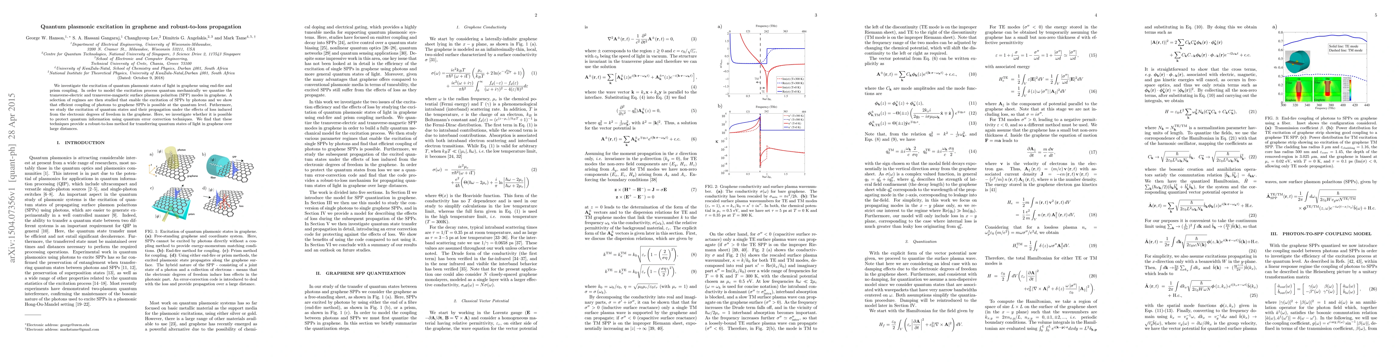 We investigate the excitation of quantum plasmonic states of light in graphene using end-fire and prism coupling. In order to model the excitation process quantum mechanically we quantize the transverse-electric and transverse-magnetic surface plasmon polariton (SPP) modes in graphene. A selection of regimes are then studied that enable the excitation of SPPs by photons and we show that efficient coupling of photons to graphene SPPs is possible at the quantum level. Futhermore, we study the excitation of quantum states and their propagation under the effects of loss induced from the electronic degrees of freedom in the graphene. Here, we investigate whether it is possible to protect quantum information using quantum error correction techniques. We find that these techniques provide a robust-to-loss method for transferring quantum states of light in graphene over large distances.