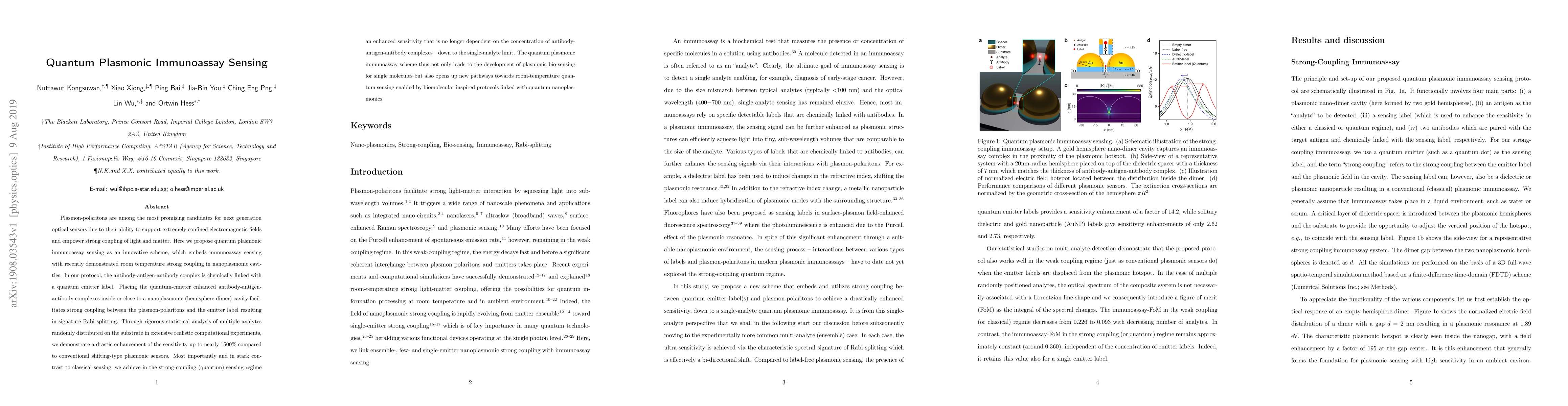 This paper proposes quantum plasmonic immunoassay sensing, embedding immunoassays with strong coupling in nanoplasmonic cavities to achieve enhanced sensitivity up to 1500% compared to conventional sensors, and demonstrates sensitivity down to single-analyte limits independent of complex concentration.