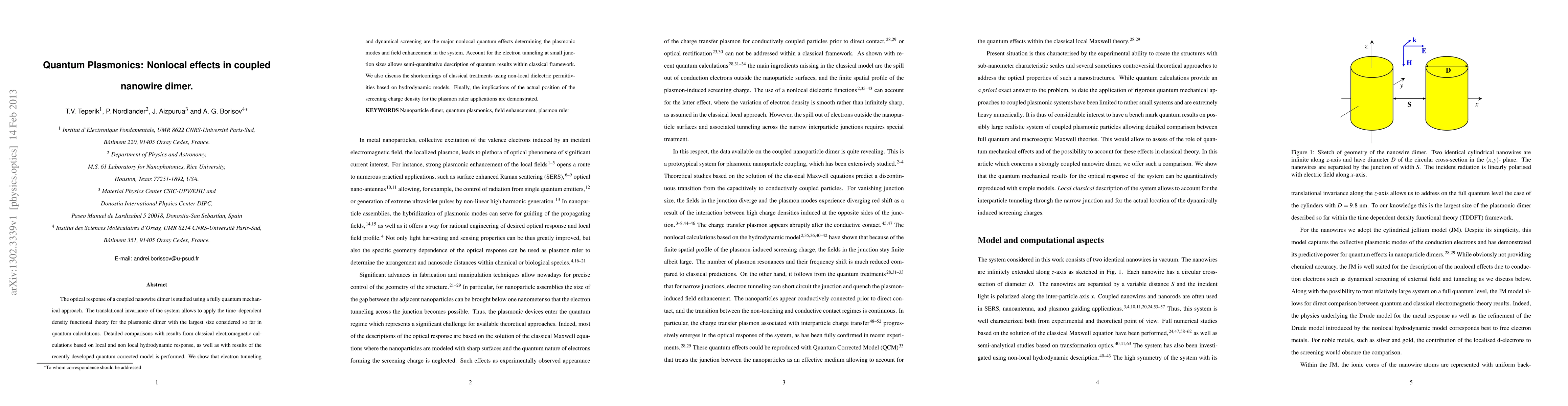 The optical response of a coupled nanowire dimer is studied using a fully quantum mechanical approach. The translational invariance of the system allows to apply the time--dependent density functional theory for the plasmonic dimer with the largest size considered so far in quantum calculations. Detailed comparisons with results from classical electromagnetic calculations based on local and non local hydrodynamic response, as well as with results of the recently developed quantum corrected model is performed. We show that electron tunneling and dynamical screening are the major nonlocal quantum effects determining the plasmonic modes and field enhancement in the system. Account for the electron tunneling at small junction sizes allows semi-quantitative description of quantum results within classical framework. We also discuss the shortcomings of classical treatments using non-local dielectric permittivities based on hydrodynamic models. Finally, the implications of the actual position of the screening charge density for the plasmon ruler applications are demonstrated.