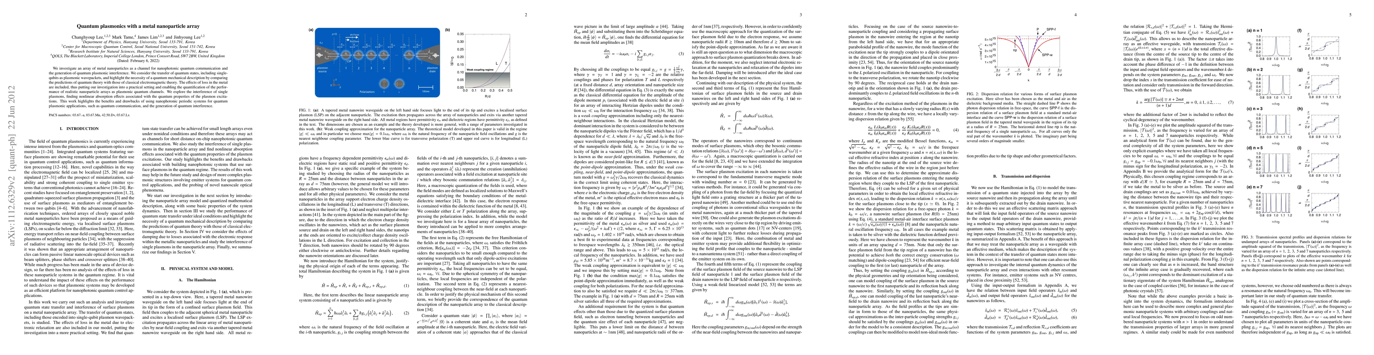 We investigate an array of metal nanoparticles as a channel for nanophotonic quantum communication and the generation of quantum plasmonic interference. We consider the transfer of quantum states, including single-qubits as plasmonic wavepackets, and highlight the necessity of a quantum mechanical description by comparing the predictions of quantum theory with those of classical electromagnetic theory. The effects of loss in the metal are included, thus putting our investigation into a practical setting and enabling the quantification of the performance of realistic nanoparticle arrays as plasmonic quantum channels. We explore the interference of single plasmons, finding nonlinear absorption effects associated with the quantum properties of the plasmon excitations. This work highlights the benefits and drawbacks of using nanophotonic periodic systems for quantum plasmonic applications, such as quantum communication, and the generation of quantum interference.
