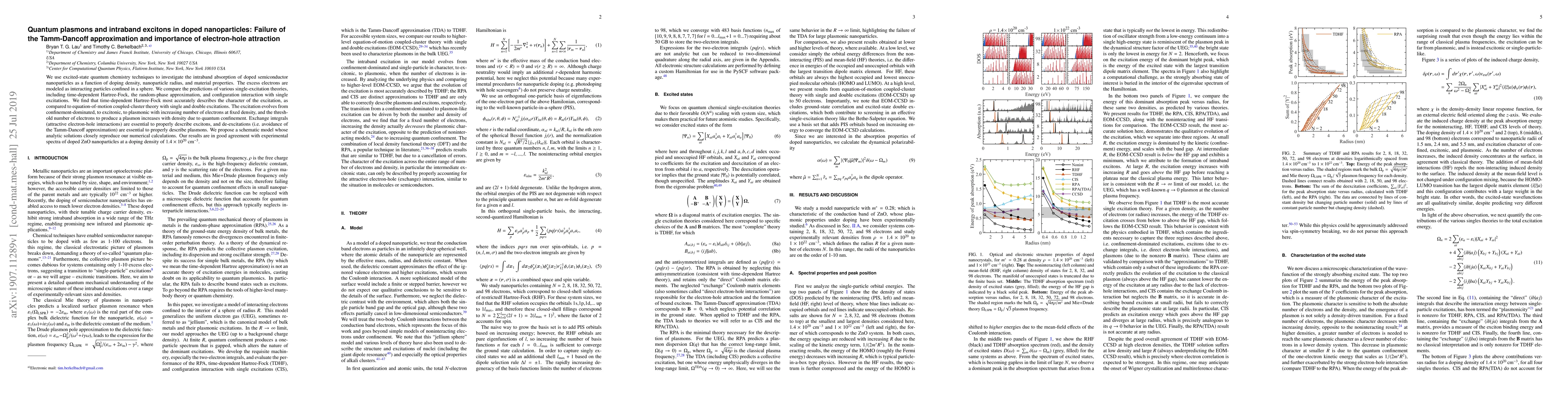 We use excited-state quantum chemistry techniques to investigate the intraband absorption of doped semiconductor nanoparticles as a function of doping density, nanoparticle radius, and material properties. The excess electrons are modeled as interacting particles confined in a sphere. We compare the predictions of various single-excitation theories, including time-dependent Hartree-Fock, the random-phase approximation, and configuration interaction with single excitations. We find that time-dependent Hartree-Fock most accurately describes the character of the excitation, as compared to equation-of-motion coupled-cluster theory with single and double excitations. The excitation evolves from confinement-dominated, to excitonic, to plasmonic with increasing number of electrons at fixed density, and the threshold number of electrons to produce a plasmon increases with density due to quantum confinement. Exchange integrals (attractive electron-hole interactions) are essential to properly describe excitons, and de-excitations (i.e.~avoidance of the Tamm-Dancoff approximation) are essential to properly describe plasmons. We propose a schematic model whose analytic solutions closely reproduce our numerical calculations. Our results are in good agreement with experimental spectra of doped ZnO nanoparticles at a doping density of $1.4\times 10^{20}$ cm$^{-3}$.