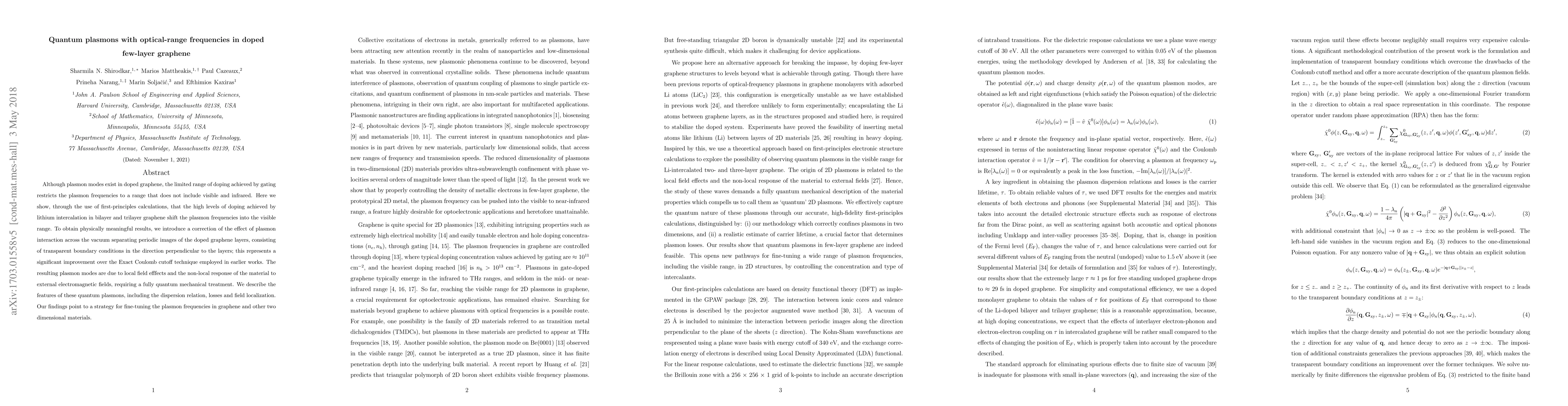 This paper demonstrates that lithium intercalation in few-layer graphene can shift plasmon frequencies into the optical range, achieved through high doping levels. The study employs first-principles calculations and introduces transparent boundary conditions to correct for plasmon interactions, revealing quantum plasmons with significant dispersion and field localization.