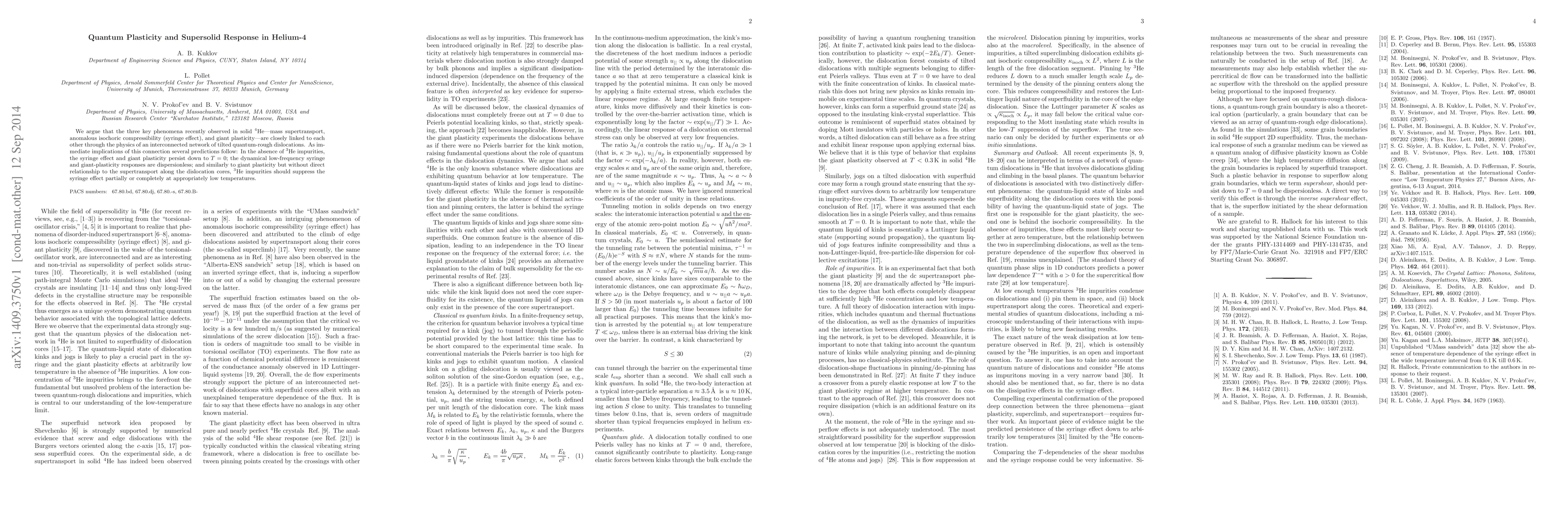 We argue that the three key phenomena recently observed in solid $^4$He---mass supertransport, anomalous isochoric compressibility (syringe effect), and giant plasticity---are closely linked to each other through the physics of an interconnected network of tilted quantum-rough dislocations. As immediate implications of this connection several predictions follow: In the absence of $^3$He impurities, the syringe effect and giant plasticity persist down to $T=0$; the dynamical low-frequency syringe and giant-plasticity responses are dispersionless; and similarly to giant plasticity but without direct relationship to the supertransport along the dislocation cores, $^3$He impurities should suppress the syringe effect partially or completely at appropriately low temperatures.