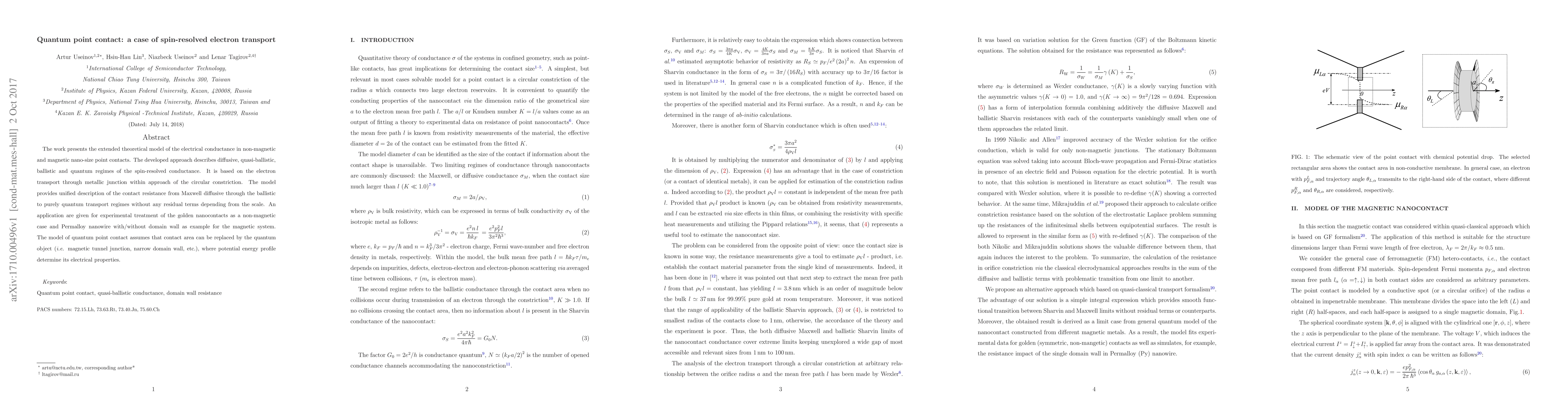 This paper develops a theoretical model for spin-resolved electron transport through quantum point contacts, encompassing both non-magnetic and magnetic systems, and describes various transport regimes from diffusive to quantum. The model provides a unified description of contact resistance across different transport regimes without scale-dependent residual terms.