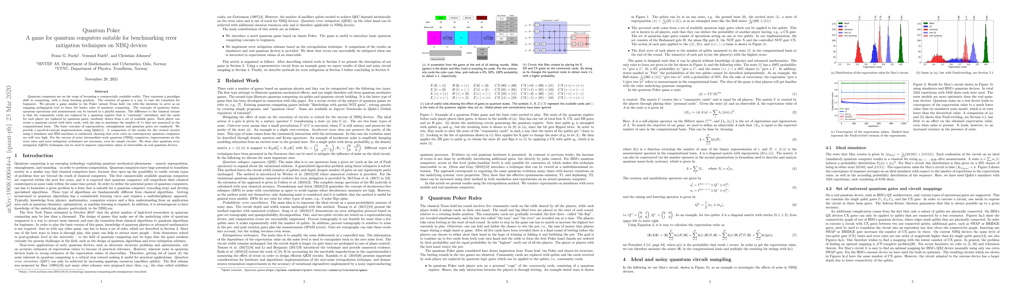 This paper introduces "Quantum Poker," a Texas hold 'em variant designed for quantum computers to teach quantum computing basics through gameplay. The game employs quantum states and gates to replace classical cards and community cards, highlighting concepts like superposition and entanglement. The study demonstrates the high error rates on current NISQ devices and showcases quantum error mitigation techniques to improve results.