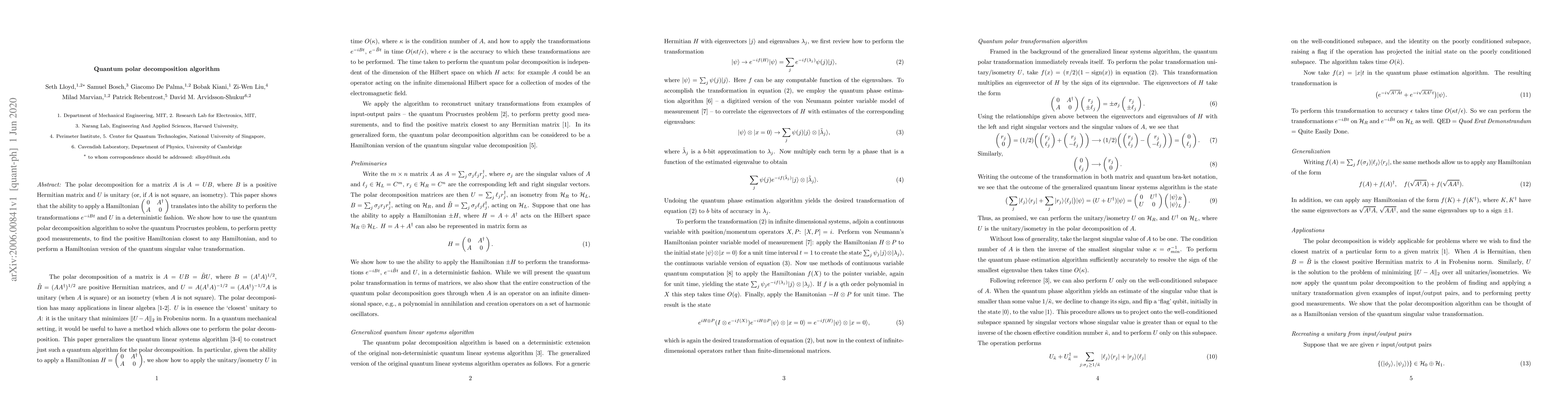 This paper introduces a quantum algorithm for matrix polar decomposition, demonstrating its application in solving the quantum Procrustes problem and other tasks, leveraging a Hamiltonian that enables the transformation of unitary and positive Hermitian matrices.