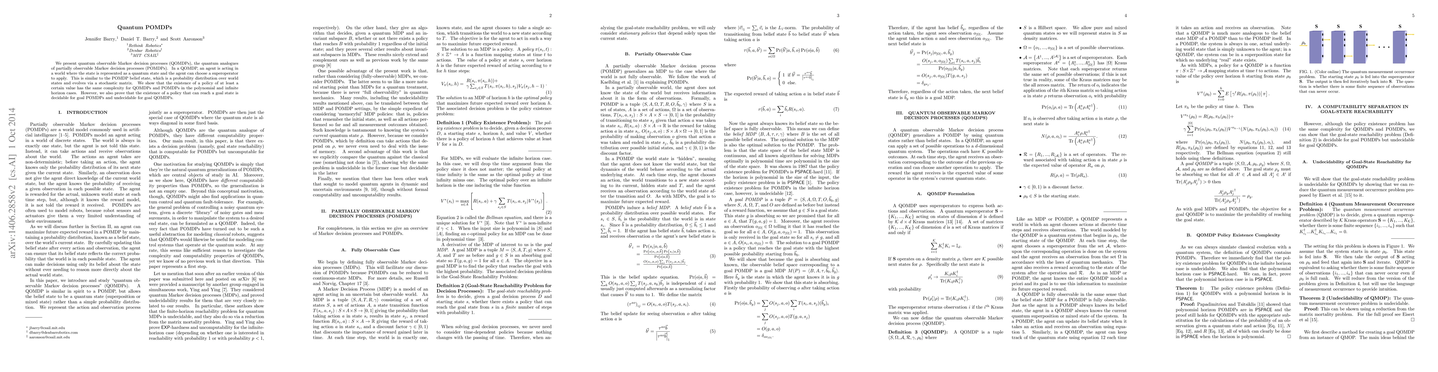 Researchers introduced quantum observable Markov decision processes (QOMDPs), a quantum analogue of POMDPs, showing that the existence of certain policies has the same complexity in both cases but differing decidability for goal states.