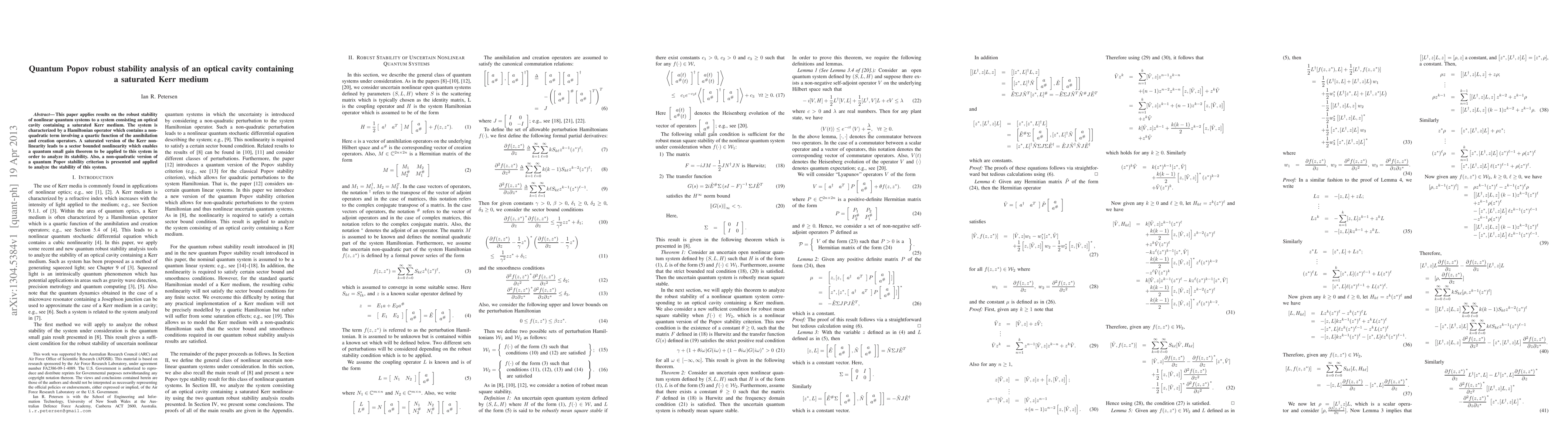This paper analyzes the stability of an optical cavity with a saturated Kerr medium using quantum small gain theorem and Popov stability criterion, finding conditions for robust stability in such systems.