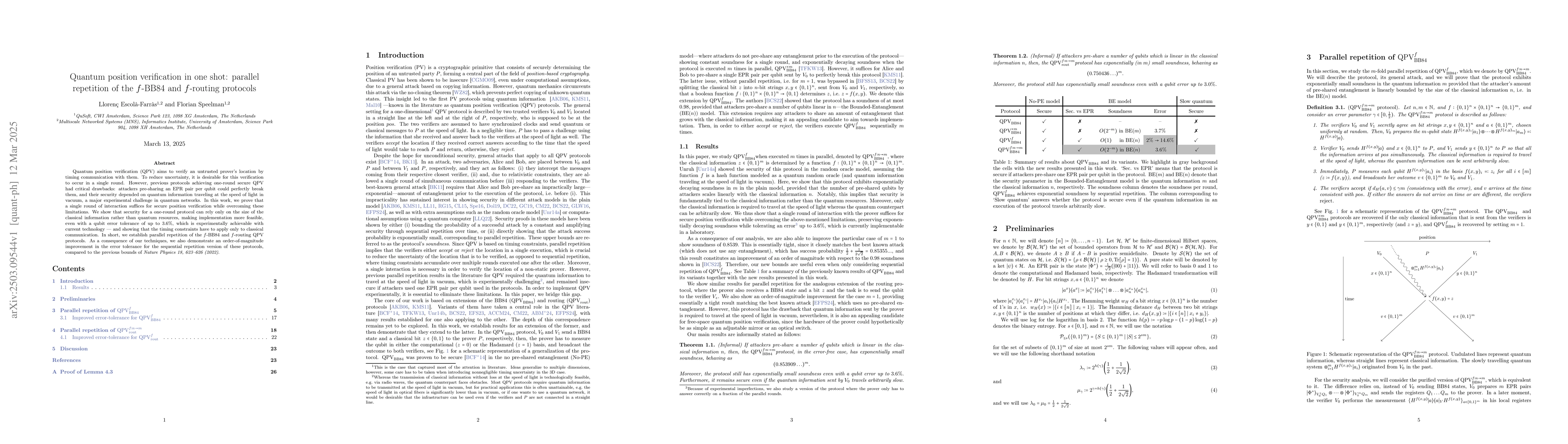 The paper presents parallel repetition of $f$-BB84 and $f$-routing QPV protocols, demonstrating that one-round secure QPV can be achieved without quantum resource dependencies related to light-speed travel.
