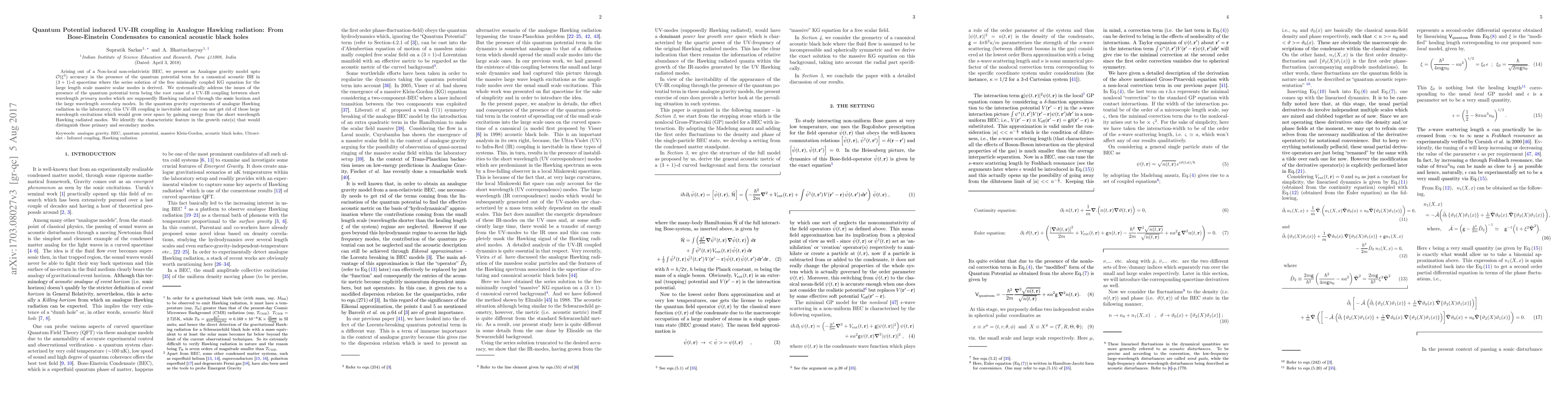 Arising out of a Non-local non-relativistic BEC, we present an Analogue gravity model upto $\mathcal{O}(\xi^{2})$ accuracy in the presence of the quantum potential term for a canonical acoustic BH in $(3+1)$-d spacetime where the series solution of the free minimally coupled KG equation for the large length scale massive scalar modes is derived. We systematically address the issues of the presence of the quantum potential term being the root cause of a UV-IR coupling between short wavelength `primary' modes which are supposedly Hawking radiated through the sonic horizon and the large wavelength `secondary' modes. In the quantum gravity experiments of analogue Hawking radiation in the laboratory, this UV-IR coupling is inevitable and one can not get rid of these large wavelength excitations which would grow over space by gaining energy from the short wavelength Hawking radiated modes. We identify the characteristic feature in the growth rate(s) that would distinguish these primary and secondary modes.