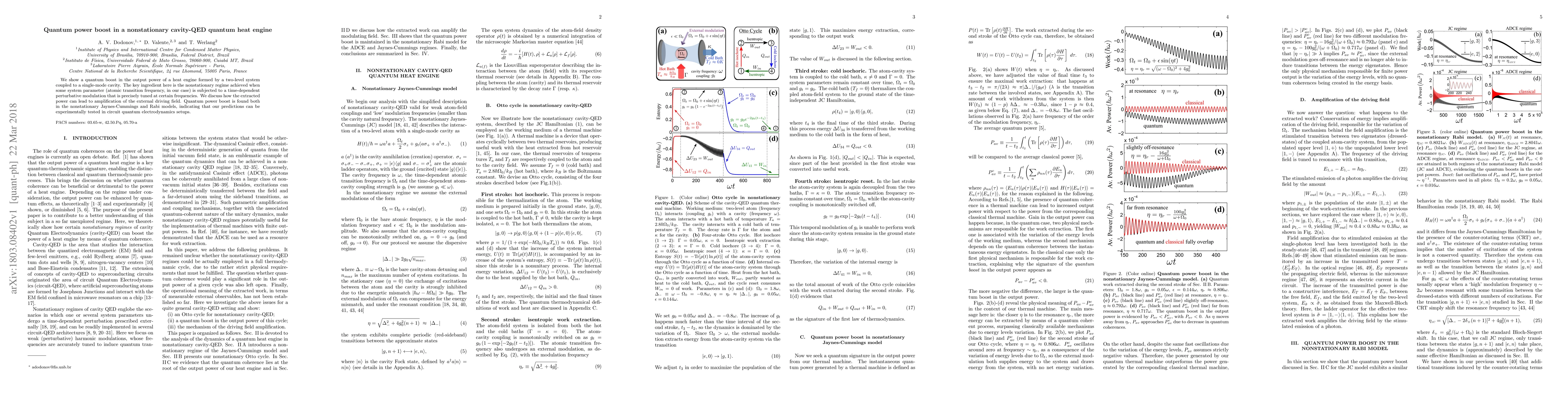 We show a quantum boost in the output power of a heat engine formed by a two-level system coupled to a single-mode cavity. The key ingredient here is the nonstationary regime achieved when some system parameter (atomic transition frequency, in our case) is subjected to a time-dependent perturbative modulation that is precisely tuned at certain frequencies. We discuss how the extracted power can lead to amplification of the external driving field. Quantum power boost is found both in the nonstationary Jaynes-Cummings and Rabi models, indicating that our predictions can be experimentally tested in circuit quantum electrodynamics setups.