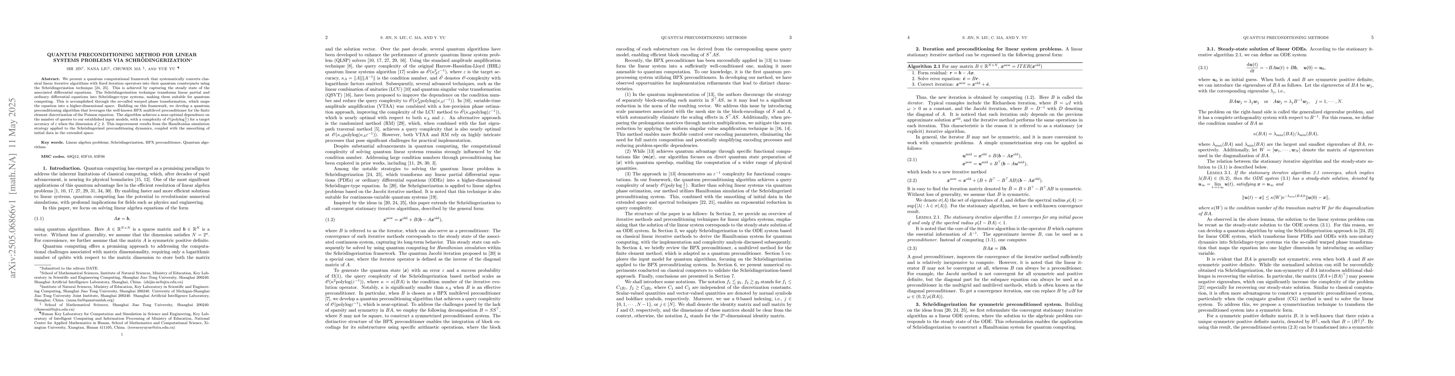 The main technical contribution is the quantum preconditioning algorithm via Schrödingerization, which offers improved complexity for solving linear systems problems on quantum computers.