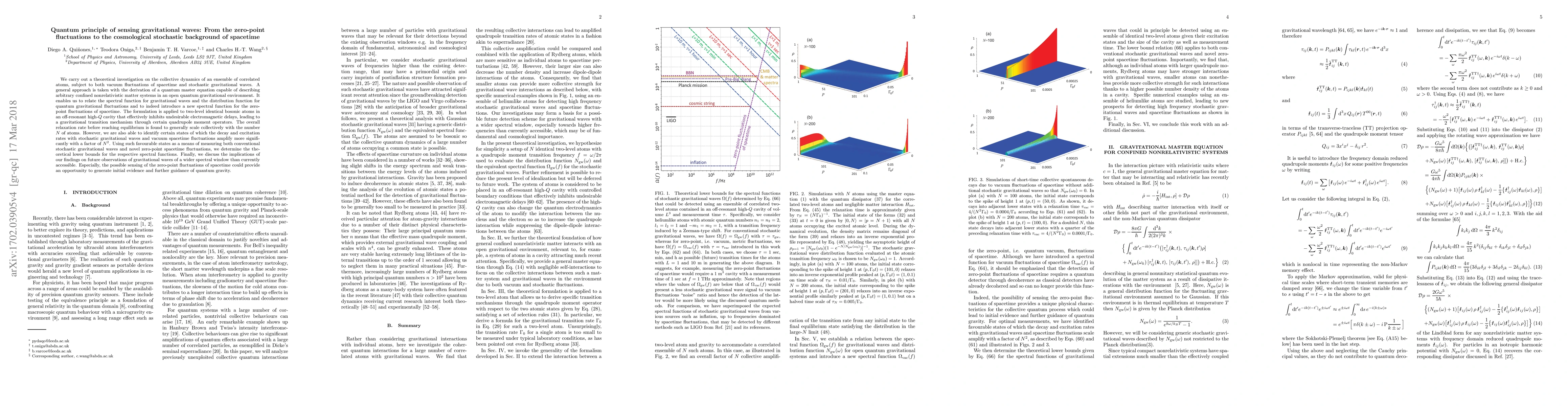 We carry out a theoretical investigation on the collective dynamics of an ensemble of correlated atoms, subject to both vacuum fluctuations of spacetime and stochastic gravitational waves. A general approach is taken with the derivation of a quantum master equation capable of describing arbitrary confined nonrelativistic matter systems in an open quantum gravitational environment. It enables us to relate the spectral function for gravitational waves and the distribution function for quantum gravitational fluctuations and to indeed introduce a new spectral function for the zero-point fluctuations of spacetime. The formulation is applied to two-level identical bosonic atoms in an off-resonant high-$Q$ cavity that effectively inhibits undesirable electromagnetic delays, leading to a gravitational transition mechanism through certain quadrupole moment operators. The overall relaxation rate before reaching equilibrium is found to generally scale collectively with the number $N$ of atoms. However, we are also able to identify certain states of which the decay and excitation rates with stochastic gravitational waves and vacuum spacetime fluctuations amplify more significantly with a factor of $N^2$. Using such favourable states as a means of measuring both conventional stochastic gravitational waves and novel zero-point spacetime fluctuations, we determine the theoretical lower bounds for the respective spectral functions. Finally, we discuss the implications of our findings on future observations of gravitational waves of a wider spectral window than currently accessible. Especially, the possible sensing of the zero-point fluctuations of spacetime could provide an opportunity to generate initial evidence and further guidance of quantum gravity.